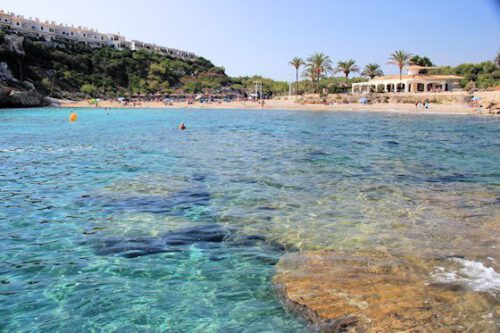 Die kleine Bucht ist ein von Felsen umsäumter Naturhafen mit feinem, weißem Sand; wegen des steinigen Untergrundes sollten zum Baden jedoch Badeschuhe getragen werden. An Land gibt es große Hotels und Apartment-Anlagen, die gegen Gebühr Sonnenliegen und –Schirme anbieten. Zum Ankern ist die nahe gelegene Bucht Cala Domingos zu empfehlen.