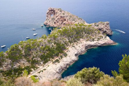 Eine der beliebtesten und schönsten Ankerbuchten der Insel mit Steinklippen. Die Die Cala Sa Foradada ist einer der schönsten Ankerplätze der Balearen. Insbesondere bei Sonnenuntergang bietet sich hier eine einzigartige Aussicht auf die herrliche, unberührte Bergwelt der Sierra de Tramontana und die Felsnase Foradada mit ihrem berühmten, runden Loch. Man kann in der kleinen Bucht ankern, bei Südwind ist die Ankermöglichkeit auf der anderen Seite der Felsen zu empfehlen.
