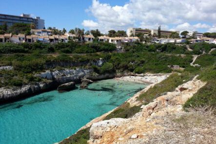 Eine versteckte kleine, felsige Badebucht mit sandigem Ankergrund auf 5 – 2,5 Metern Tiefe. Die Cala Arsenau liegt in der Nähe des ehemaligen Fischerdorfs Portocolom. Hier kann man in Ruhe im kristallklaren, karibischen Wasser baden oder einen Snack im Chiringuito genießen.