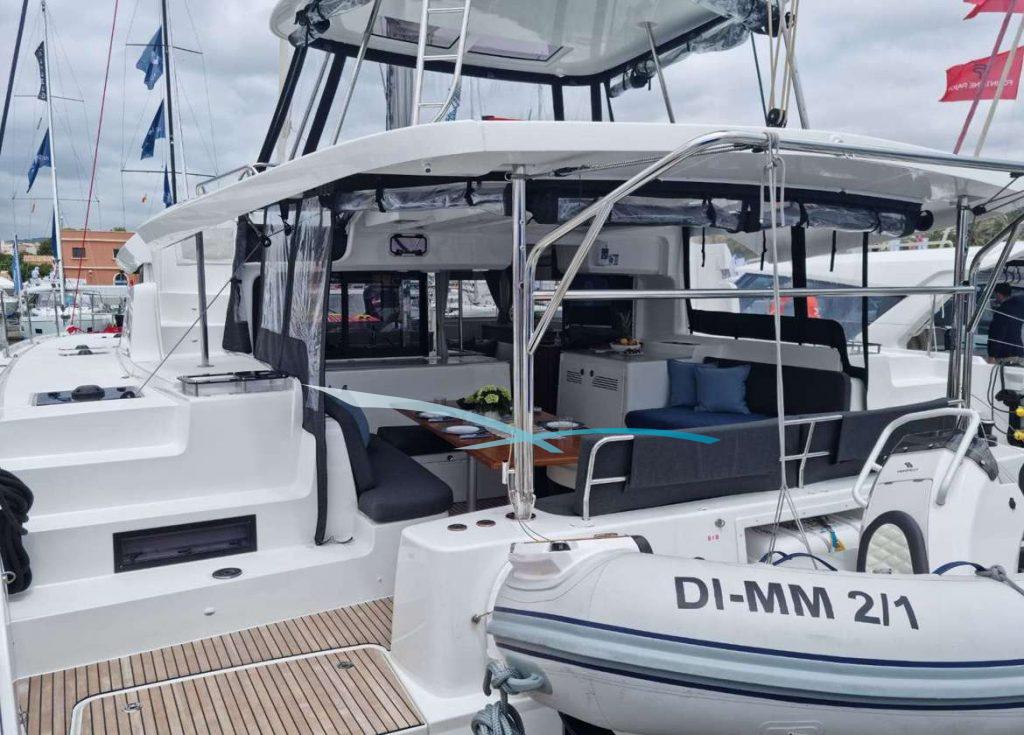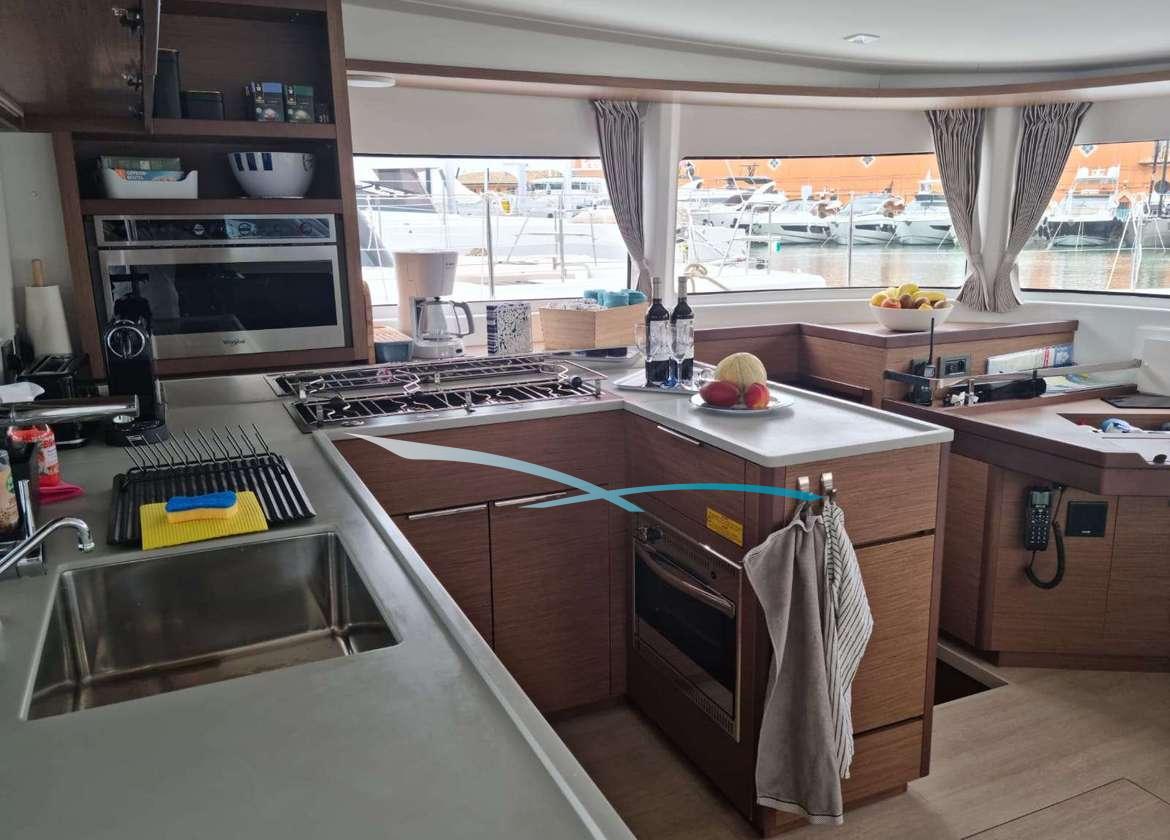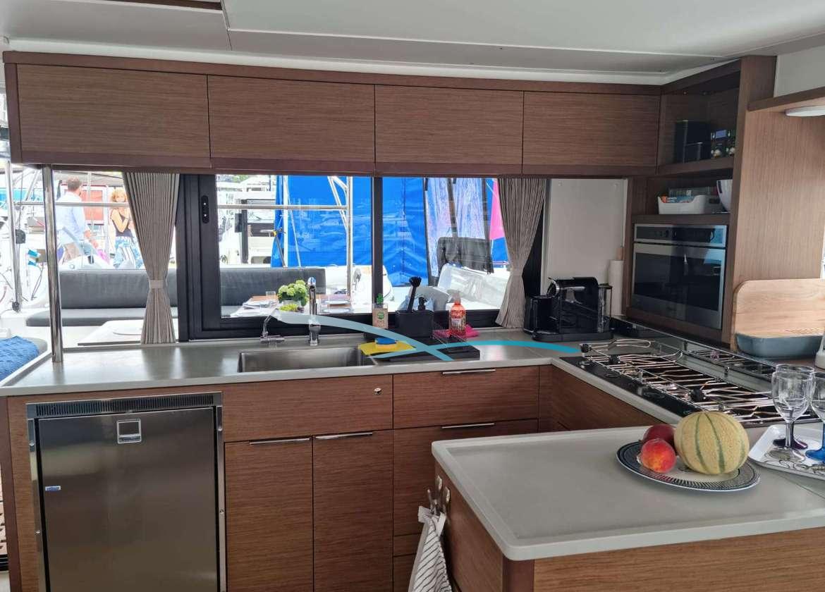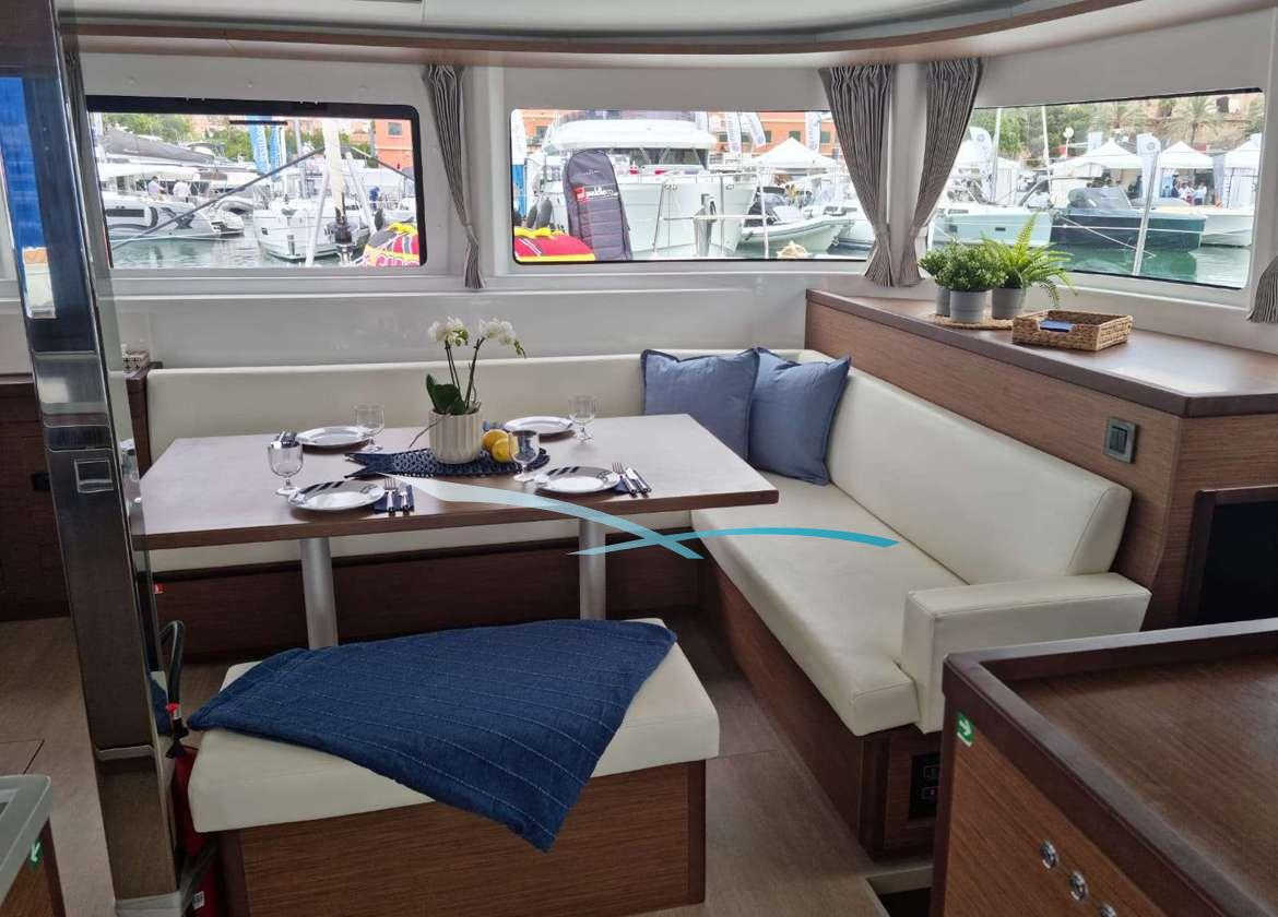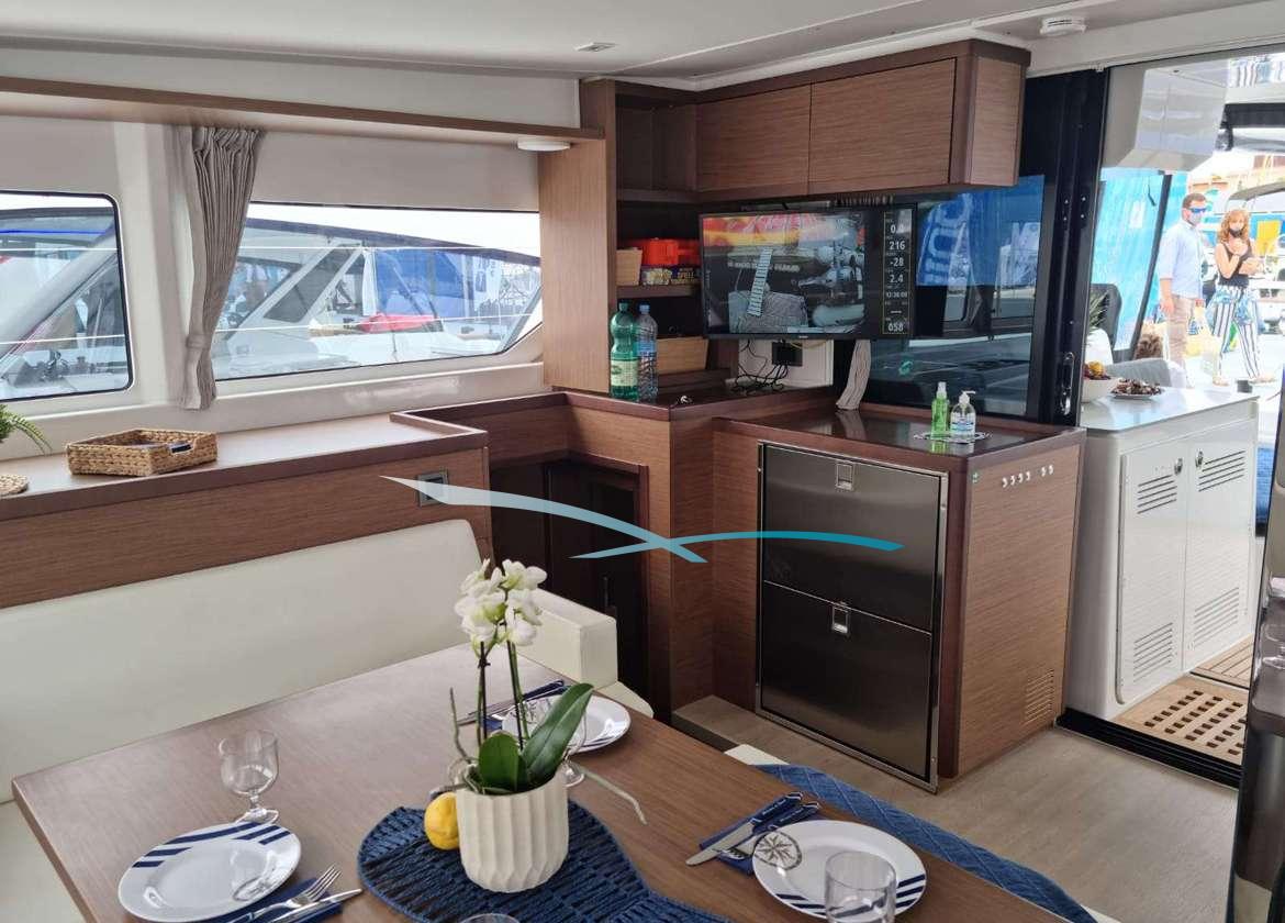 Air conditioning and a dishwasher are available for extra comfort. In order not to be dependent on the expensive and difficult-to-book moorings for catamarans on Mallorca and Ibiza, a generator provides the power supply and a watermaker (desalination system) supplies the yacht with fresh water even at anchor. A dinghy (50 hp outboard motor) is available for sporty guests. A donut for towing and a SUP/paddleboard are also included.