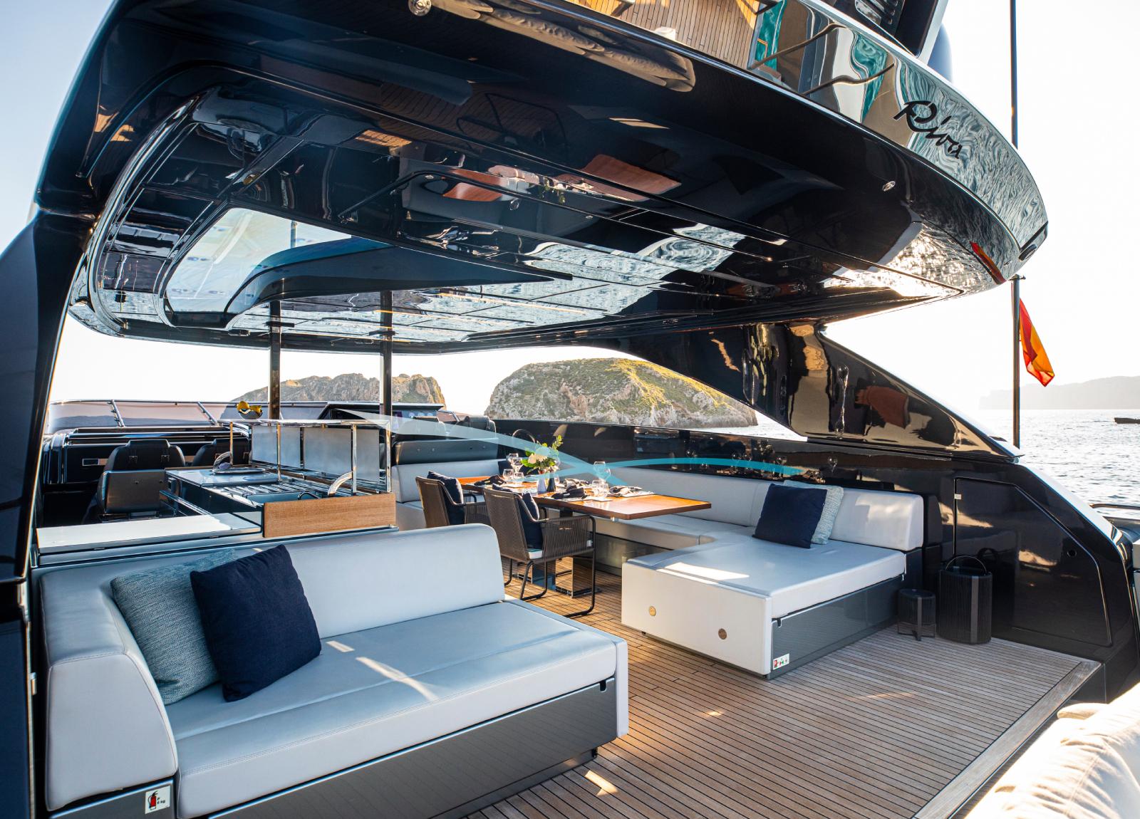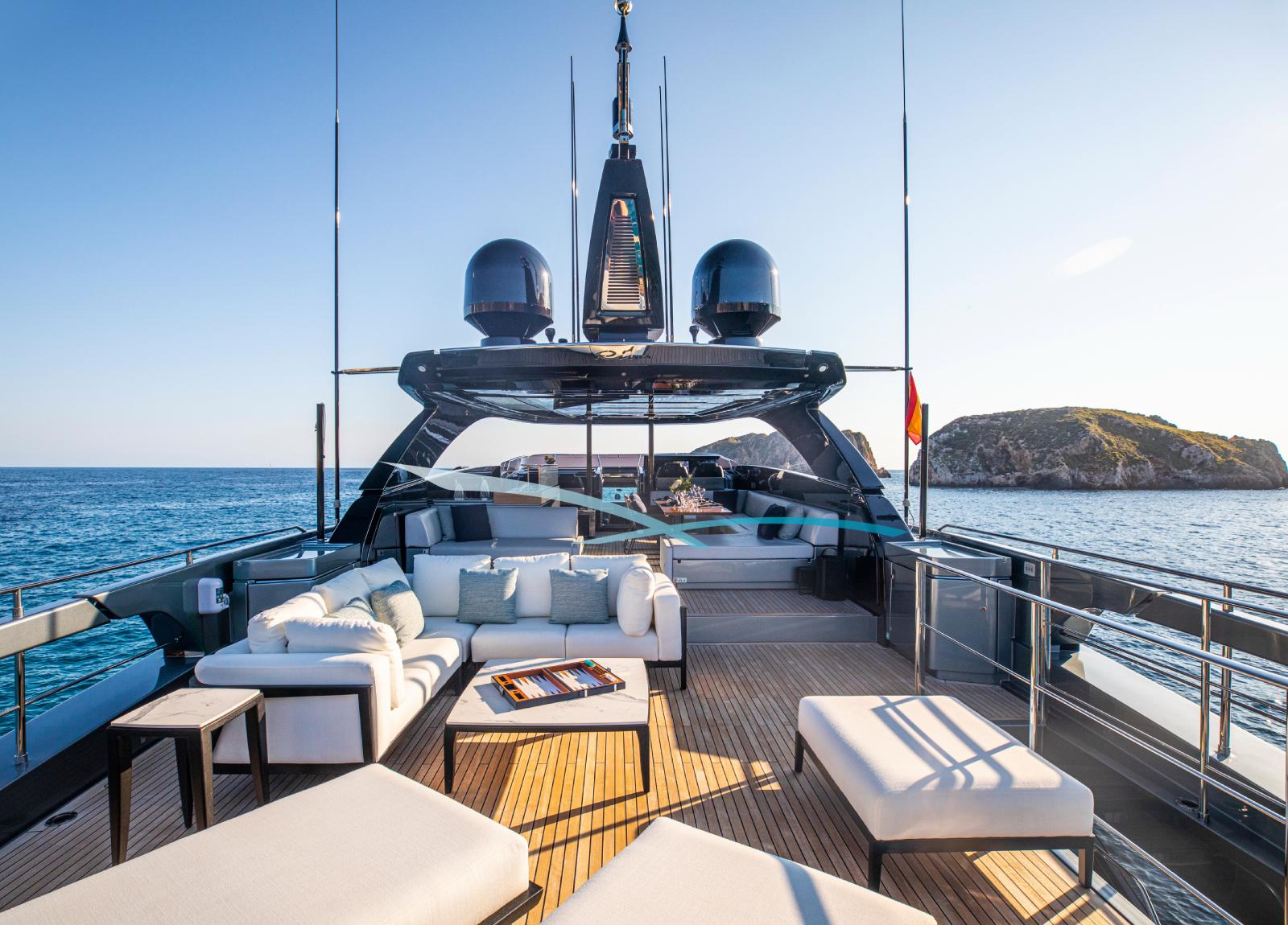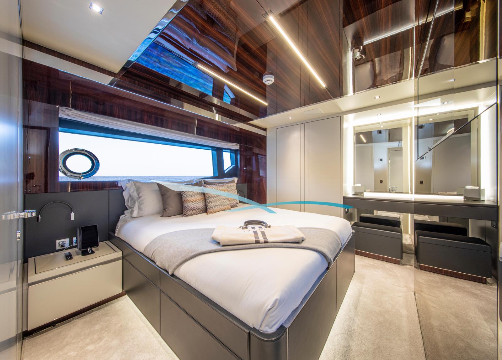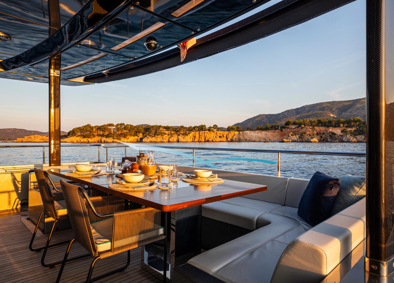 Der offene Salon ist durch die raumhohen Fenster in natürliches Licht getaucht und schafft ein perfektes Ambiente mit Meerblick. Das Hauptdeck achtern eignet sich perfekt für gemütliche Mittagessen, während das Vorderdeck mit einem C-förmigen Sofa, Sonnenliegen und einem nach vorne gerichteten Whirlpool mit versenkbarer Hardtop-Abdeckung ausgestattet ist. Die Flybridge bietet eine zusätzliche Freiluftdimension mit Glaspaneelen und einem abgelegenen Barbereich. Die ausfahrbare Badeplattform dient sowohl als Sonnenbad als auch als bequemer Startpunkt für verschiedene Wasserspielzeuge.