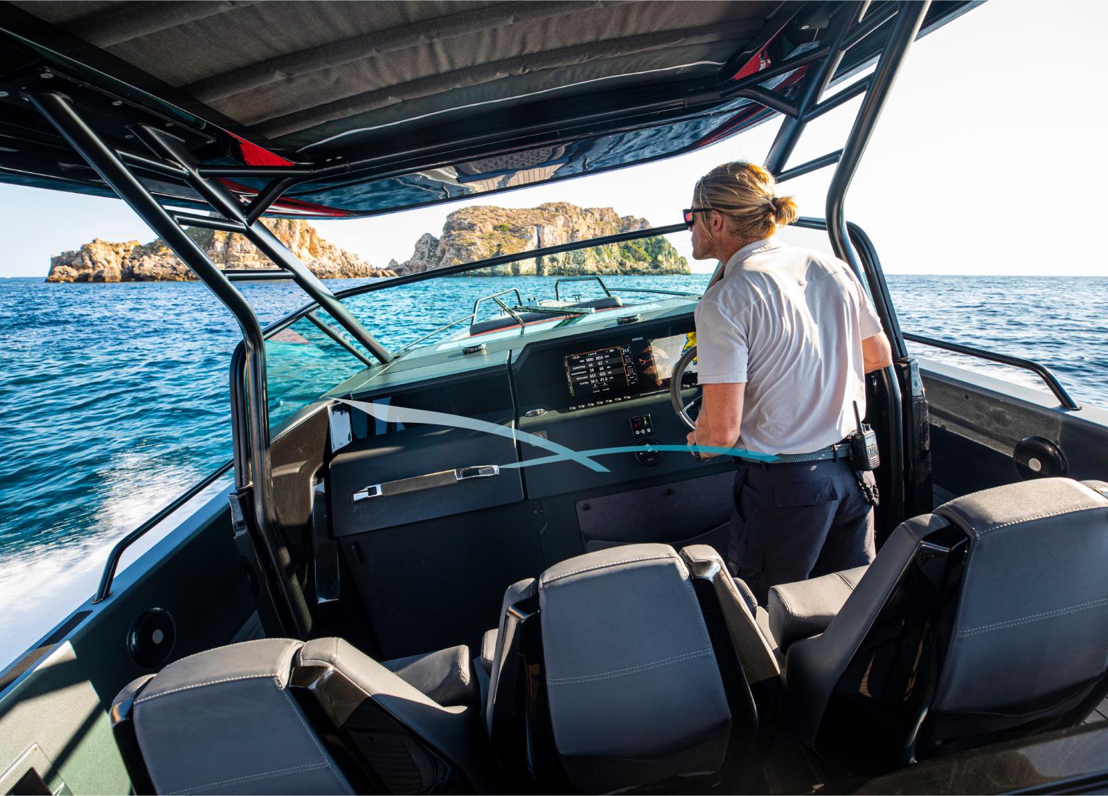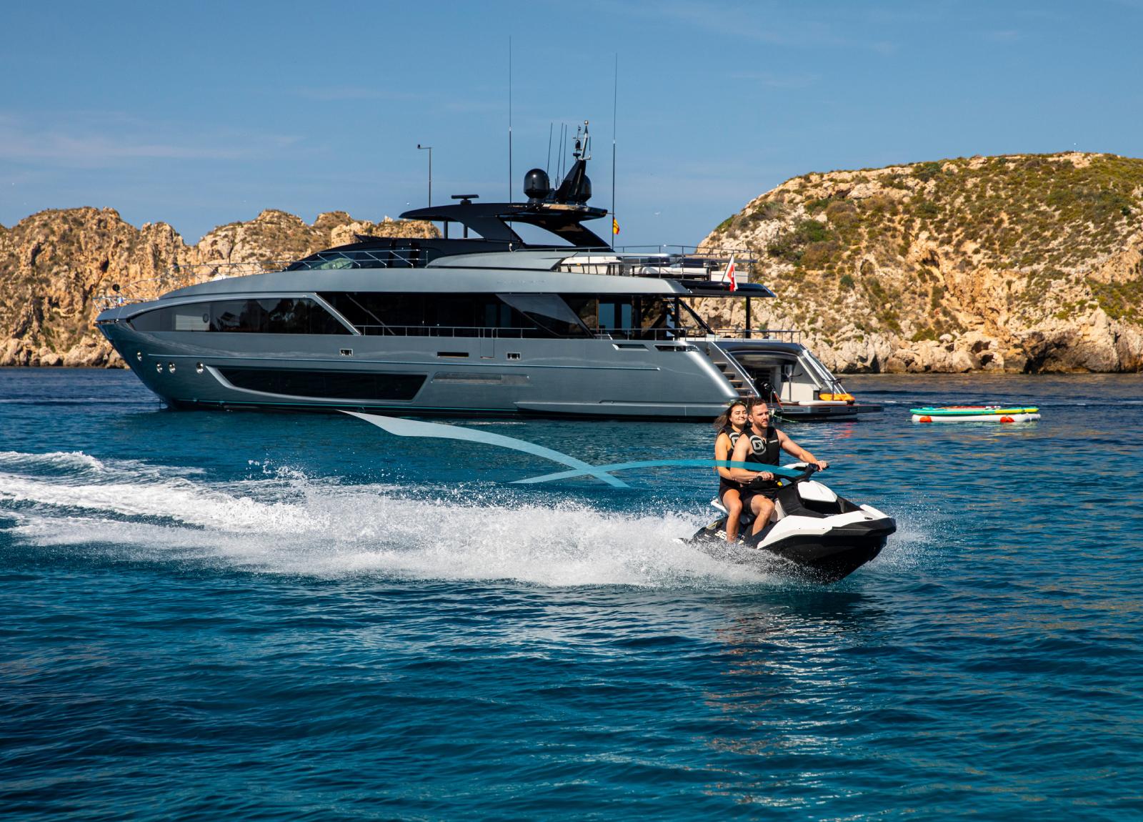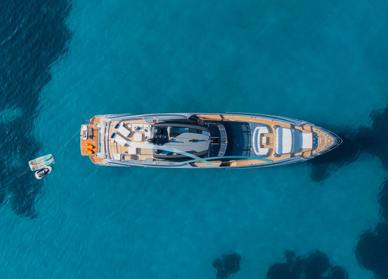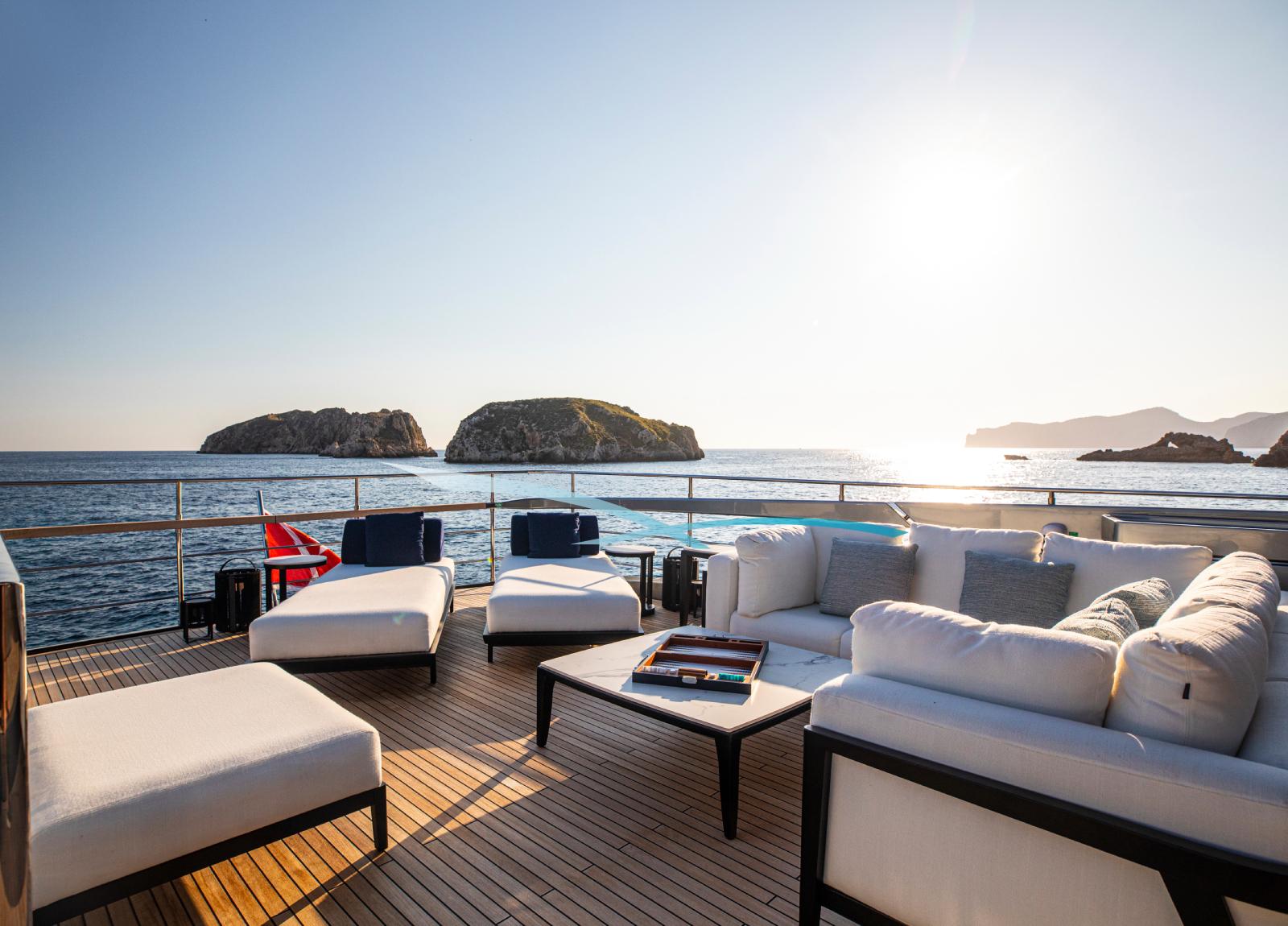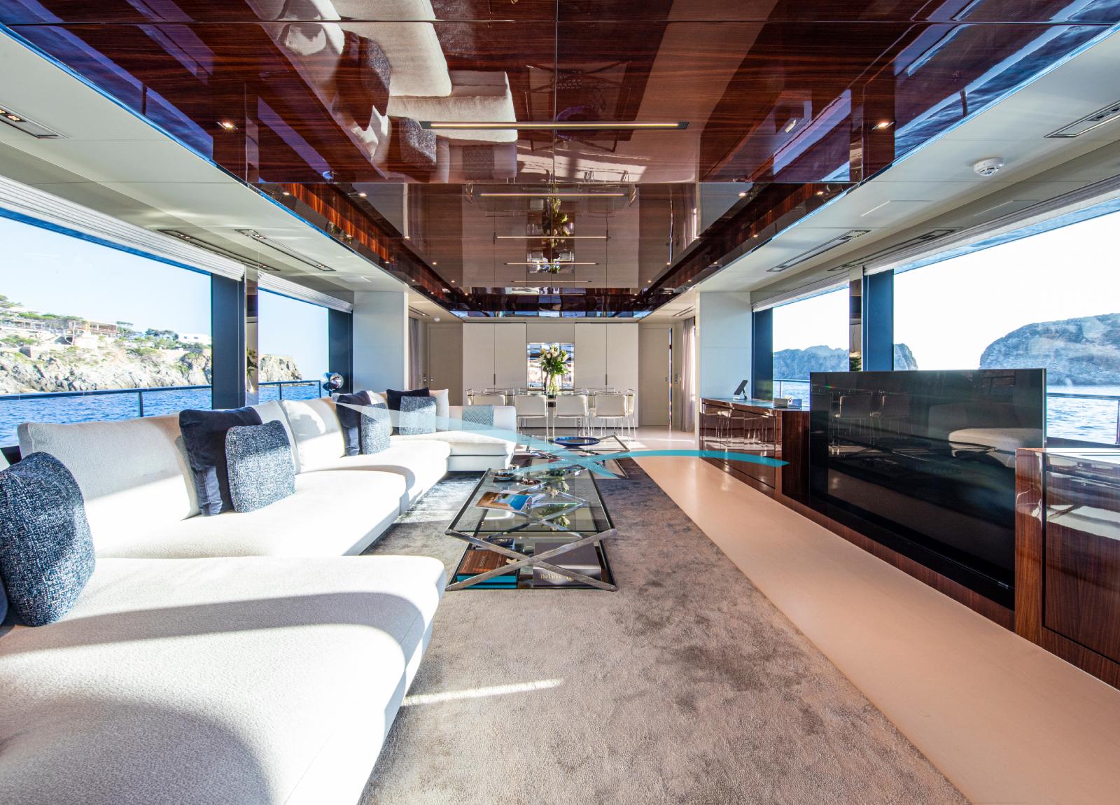 Der offene Salon ist durch die raumhohen Fenster in natürliches Licht getaucht und schafft ein perfektes Ambiente mit Meerblick. Das Hauptdeck achtern eignet sich perfekt für gemütliche Mittagessen, während das Vorderdeck mit einem C-förmigen Sofa, Sonnenliegen und einem nach vorne gerichteten Whirlpool mit versenkbarer Hardtop-Abdeckung ausgestattet ist. Die Flybridge bietet eine zusätzliche Freiluftdimension mit Glaspaneelen und einem abgelegenen Barbereich. Die ausfahrbare Badeplattform dient sowohl als Sonnenbad als auch als bequemer Startpunkt für verschiedene Wasserspielzeuge.