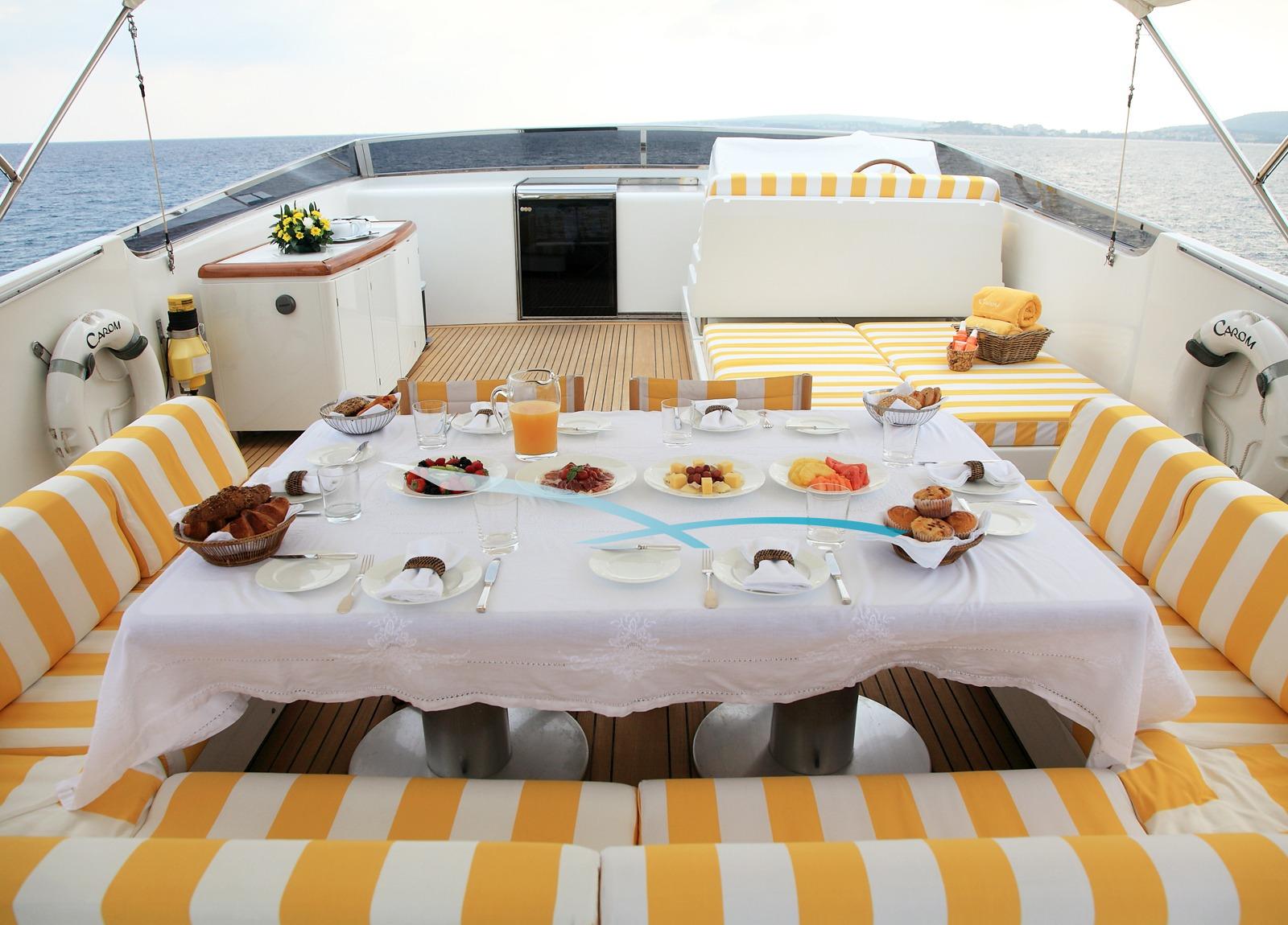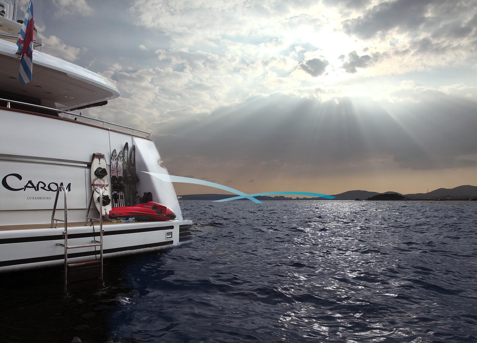 Auch für Abenteuerlustige hat die „Carom“ einiges zu bieten. Die Ausstattung umfasst eine große Auswahl an Wasserspielzeug, darunter Jetski, Seabob, Wakeboard, Wasserski, Schnorchel-Gear, Donut und Banana – perfekt für abwechslungsreiche Stunden im und auf dem Wasser.