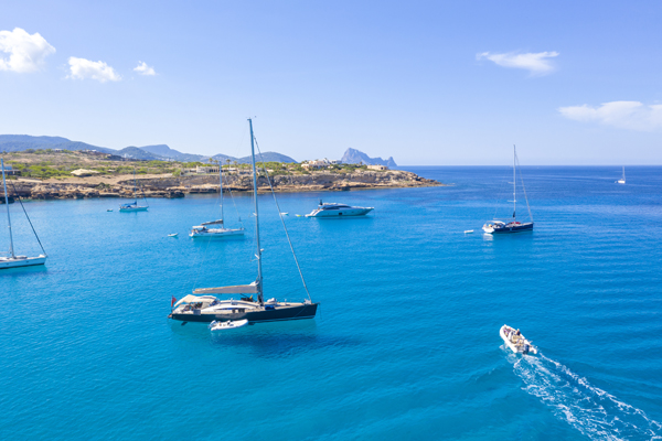 Nachdem Sie sich in Port d‘ Andratx für den Tag gestärkt haben, machen Sie sich auf den Weg nach Ibiza. Die Strecke führt Sie über das offene Meer. Kommen Sie jedoch an der Südküste der Insel an, können Sie einige Zwischenstops an den nahegelegenen Buchten machen. Hier bietet sich zum Beispiel die Bucht Cala Llonga an, die von hohen Felswänden eingerahmt wird. Es gibt die Möglichkeit schwimmen und tauchen zu gehen. In der Bucht selbst gibt es viele Restaurants und Supermärkte sowie eine Apotheke.