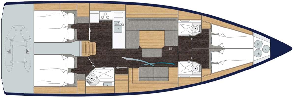Kommen Sie an Bord und fühlen Sie sich wie zu Hause. Diese Allrounder-Segelyacht ist mit einer großzügigen Badeplattform, einem geräumigen Cockpit und einem hellen Salon ausgestattet. Die Yacht glänzt mit Stil und Persönlichkeit und bietet 8 Kojen aufgeteilt auf 4 Doppelkabinen.