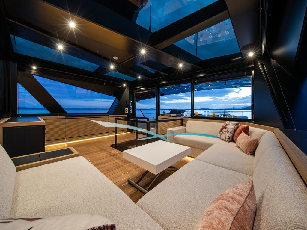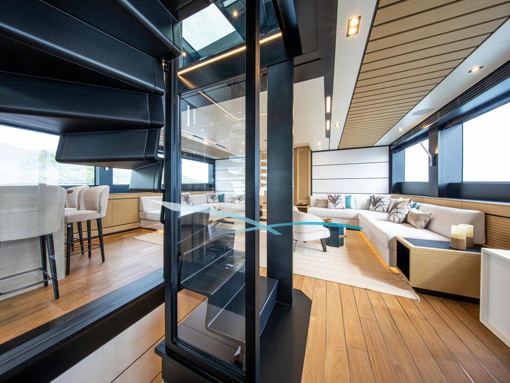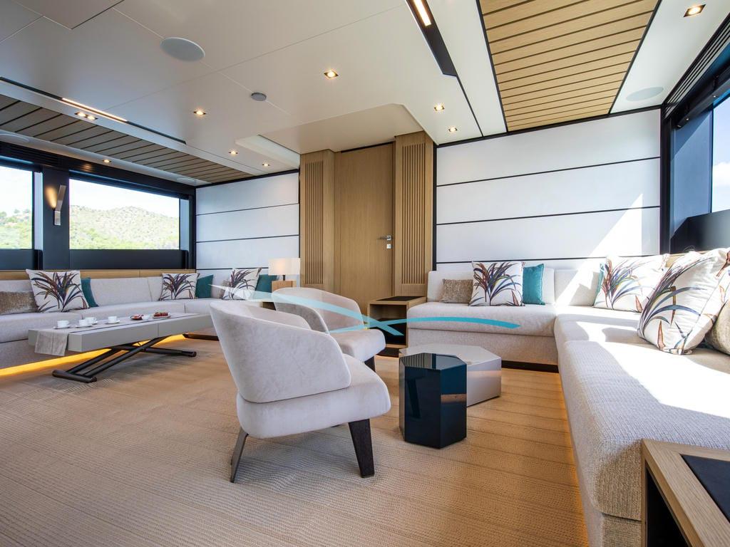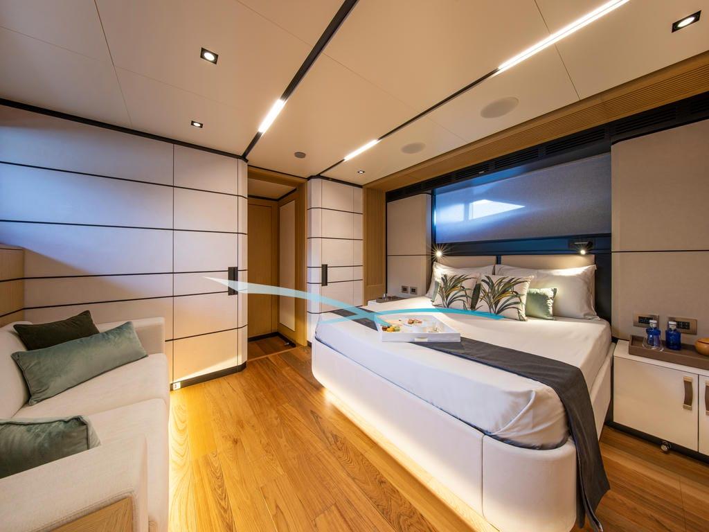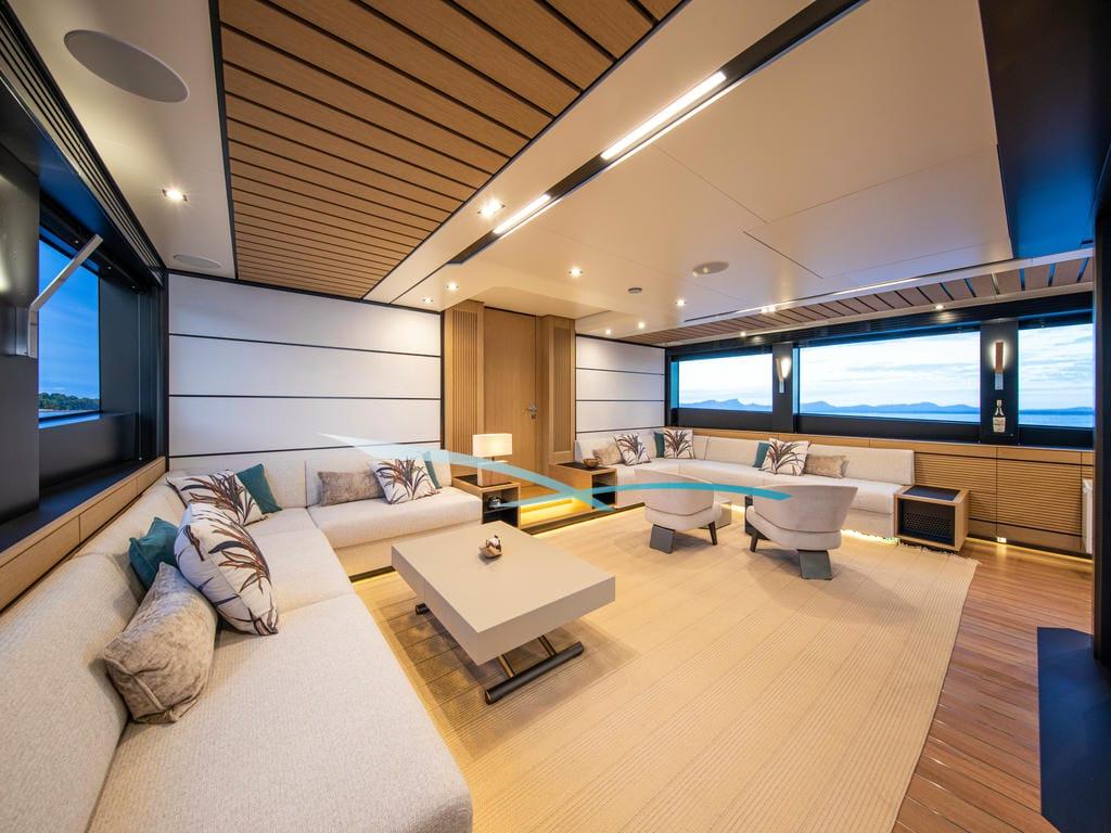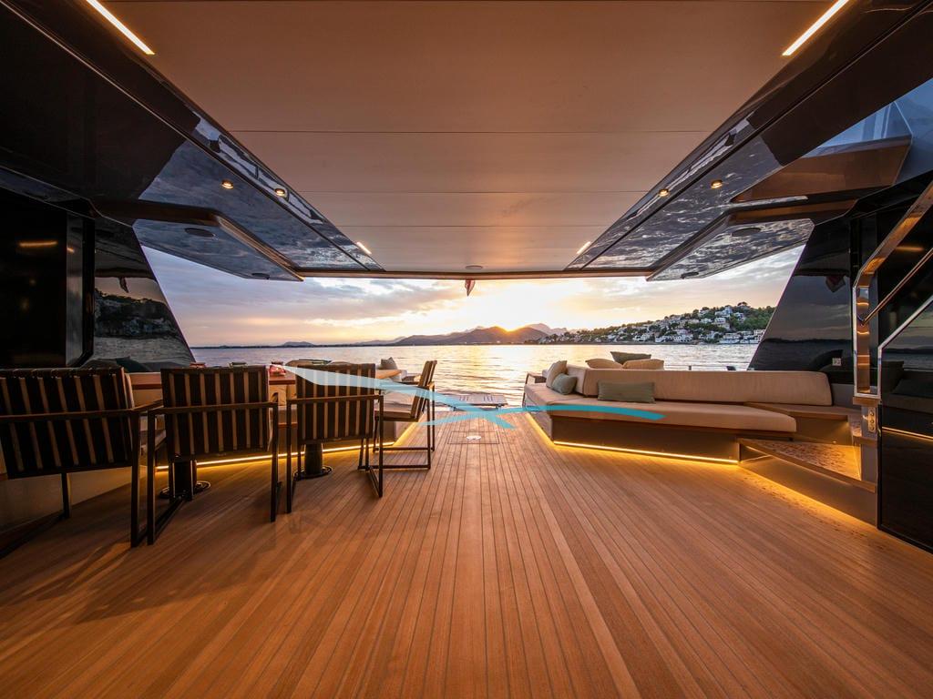 Die Yacht integriert nahtlos die Technologie mit einem fortschrittlichen Infotainmentsystem. Akustischer Komfort wird groß geschrieben, und die Stabilität wird durch elektrohydraulische Stabilisierungsflossen gewährleistet. Die Sicherheit wird durch Unterwasser- und Bugbeleuchtung erhöht.