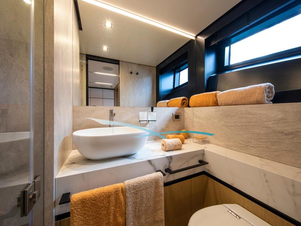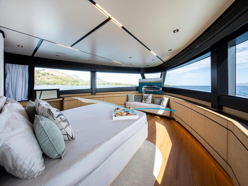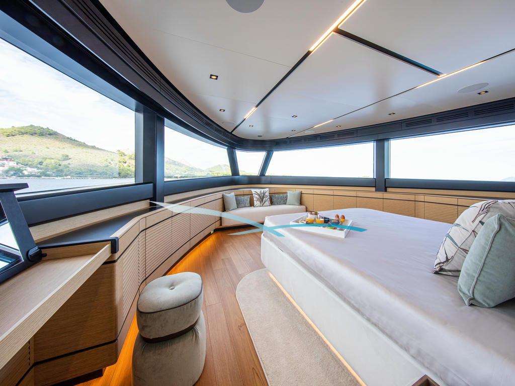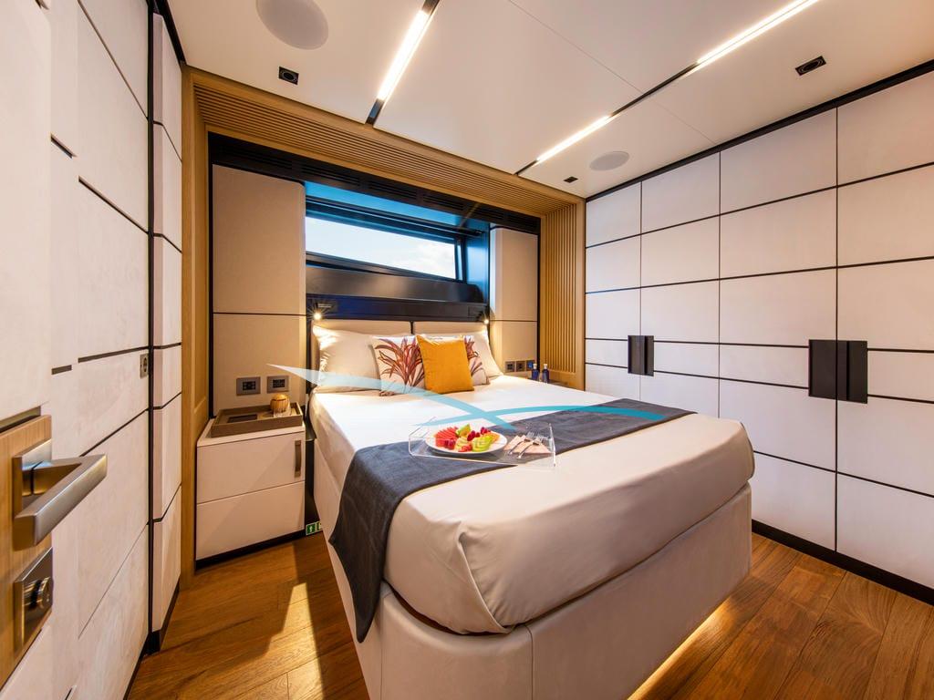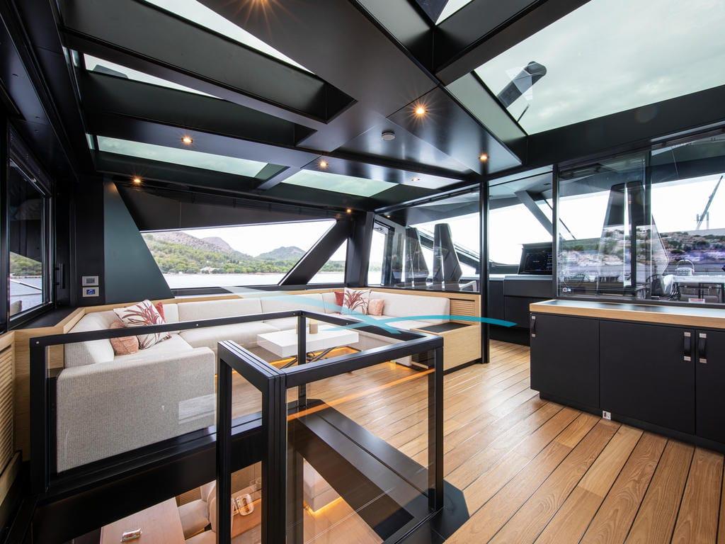 Die Yacht integriert nahtlos die Technologie mit einem fortschrittlichen Infotainmentsystem. Akustischer Komfort wird groß geschrieben, und die Stabilität wird durch elektrohydraulische Stabilisierungsflossen gewährleistet. Die Sicherheit wird durch Unterwasser- und Bugbeleuchtung erhöht.