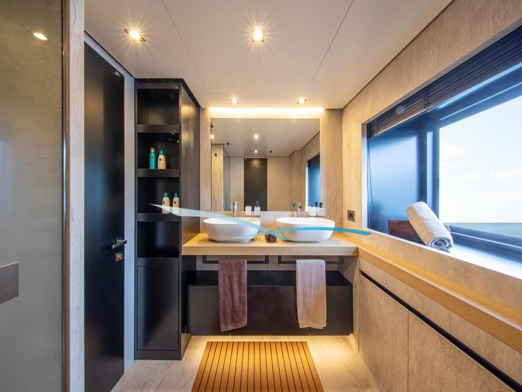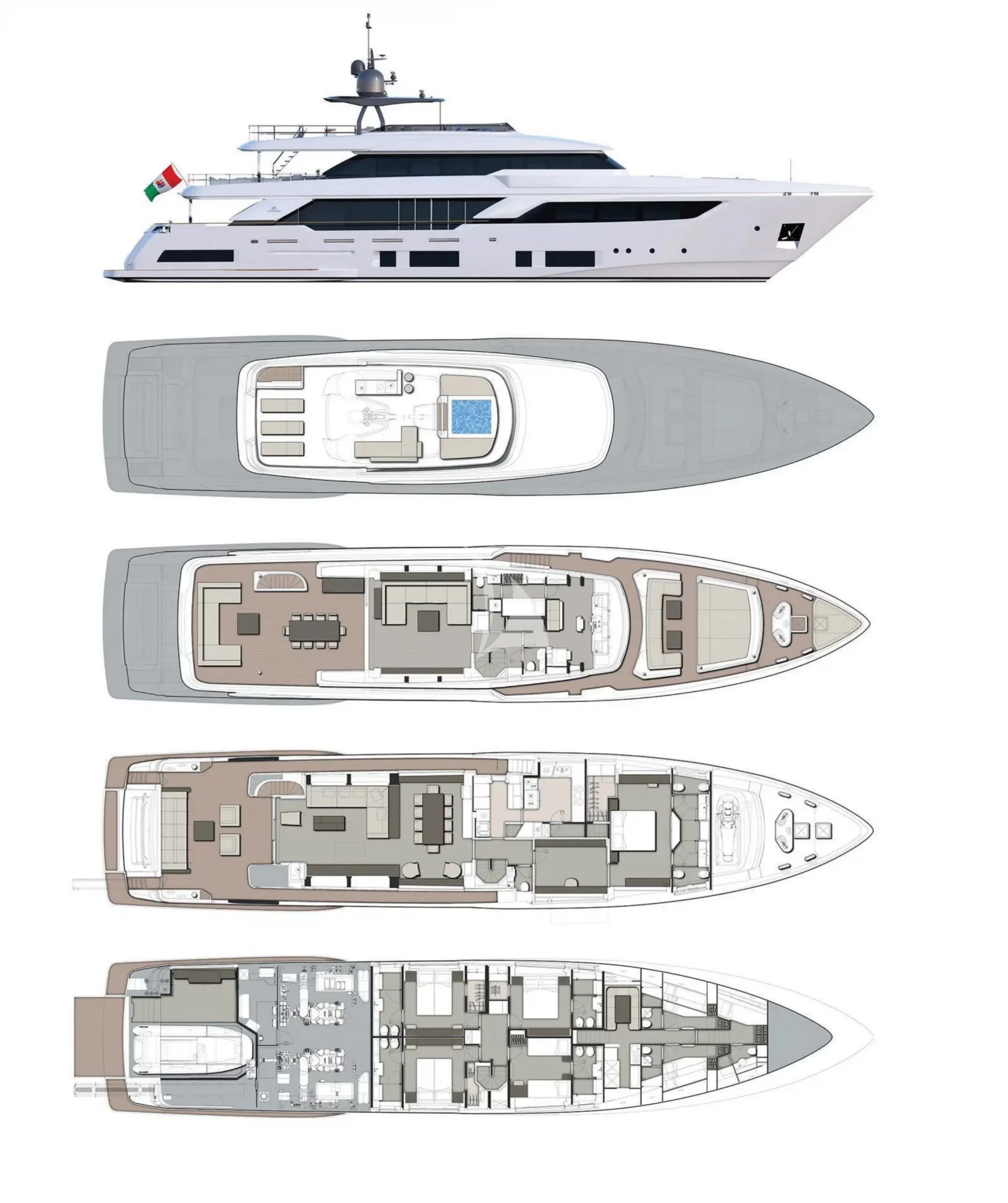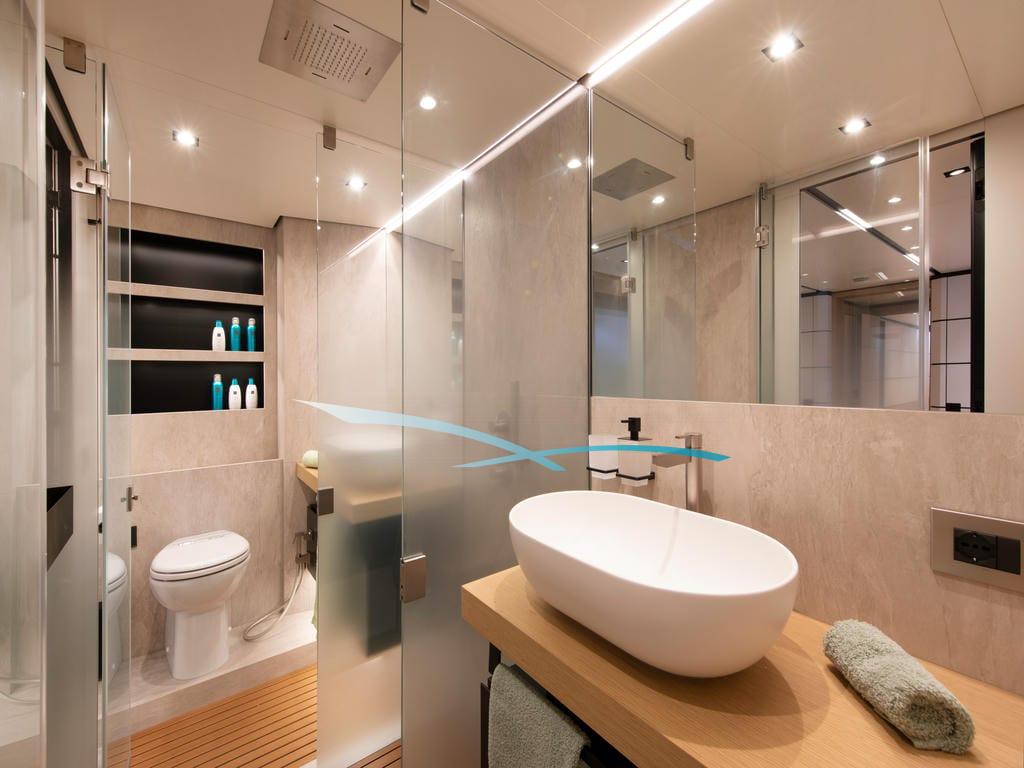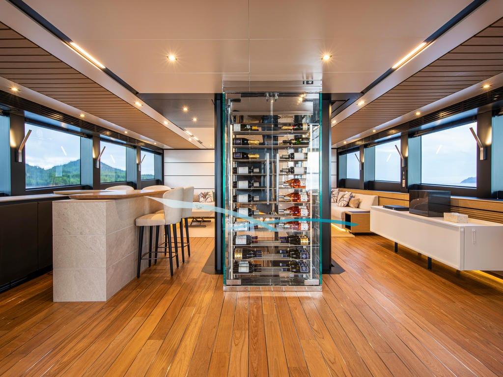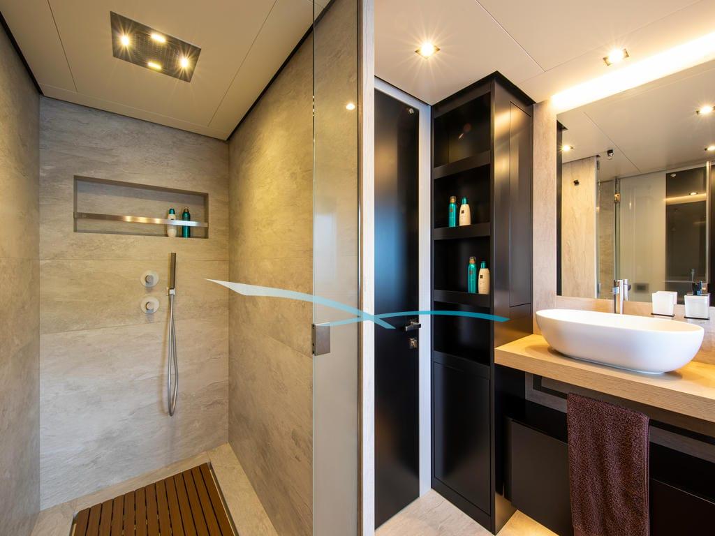 Die Yacht integriert nahtlos die Technologie mit einem fortschrittlichen Infotainmentsystem. Akustischer Komfort wird groß geschrieben, und die Stabilität wird durch elektrohydraulische Stabilisierungsflossen gewährleistet. Die Sicherheit wird durch Unterwasser- und Bugbeleuchtung erhöht.