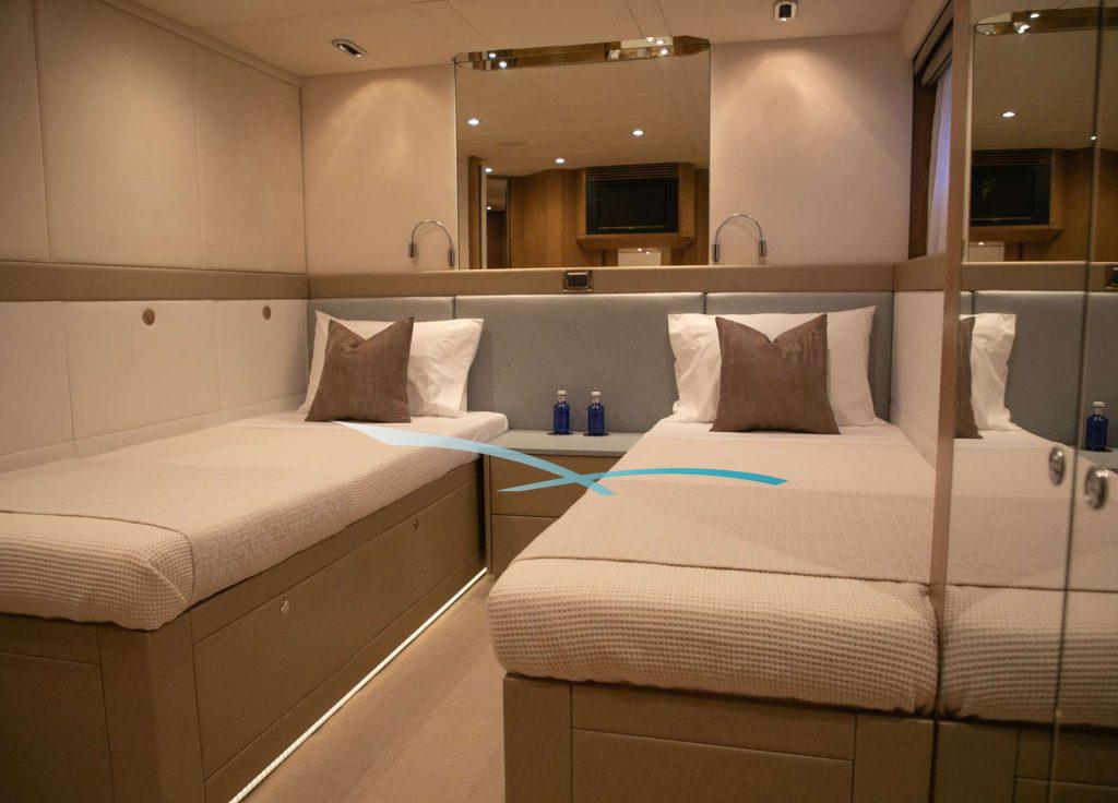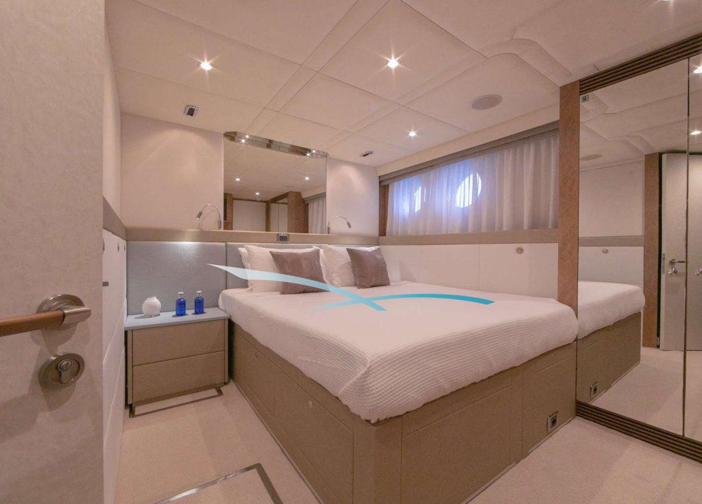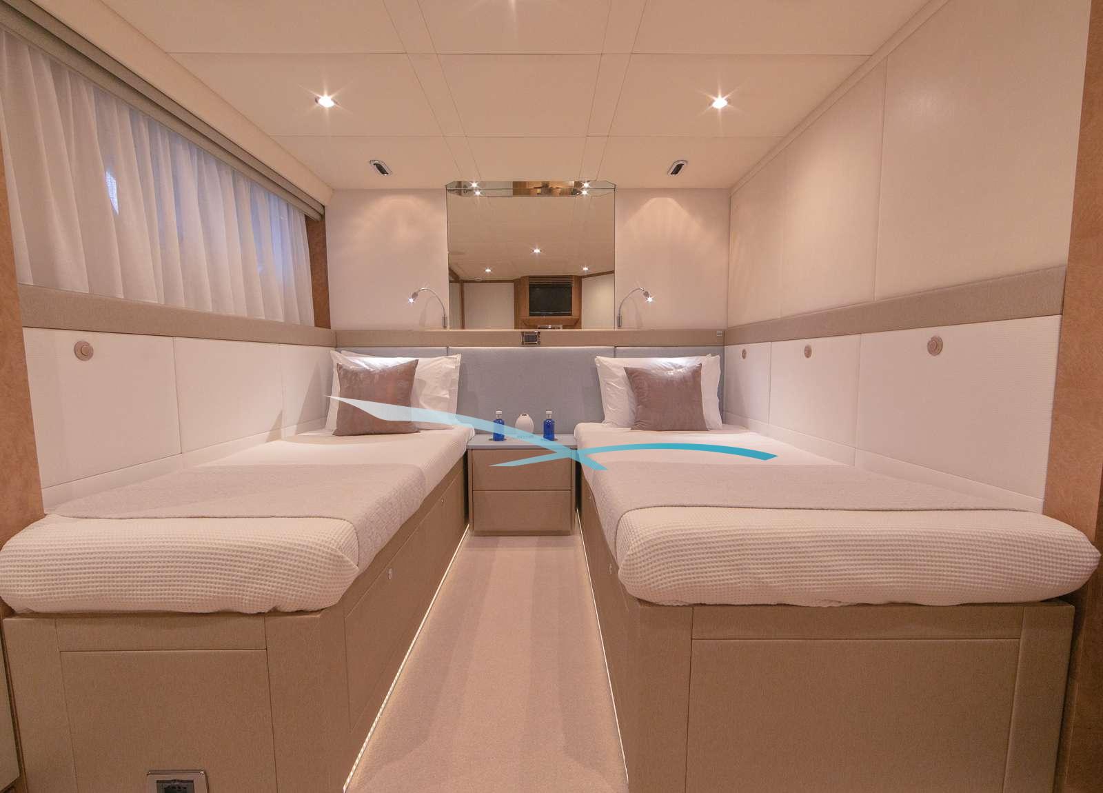 Die Raumaufteilung an Bord ist flexibel und durchdacht: Die großzügige Hauptkabine lässt sich bei Bedarf in zwei separate Doppelkabinen unterteilen. Zusätzlich stehen zwei weitere Kabinen zur Verfügung, die je nach Wunsch mit Doppel- oder Einzelbetten ausgestattet sind. Pullman-Betten bieten zusätzlichen Schlafplatz für jüngere Gäste – insgesamt finden bis zu zehn Personen bequem Platz.