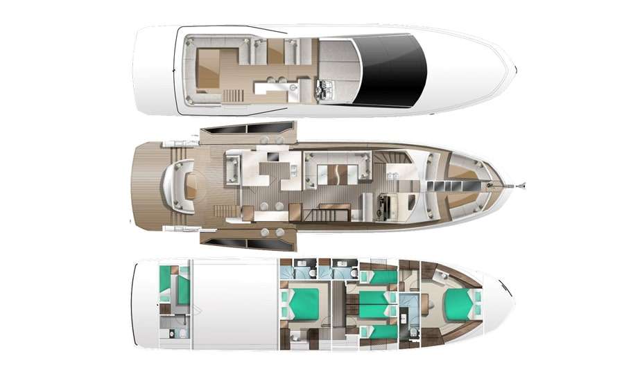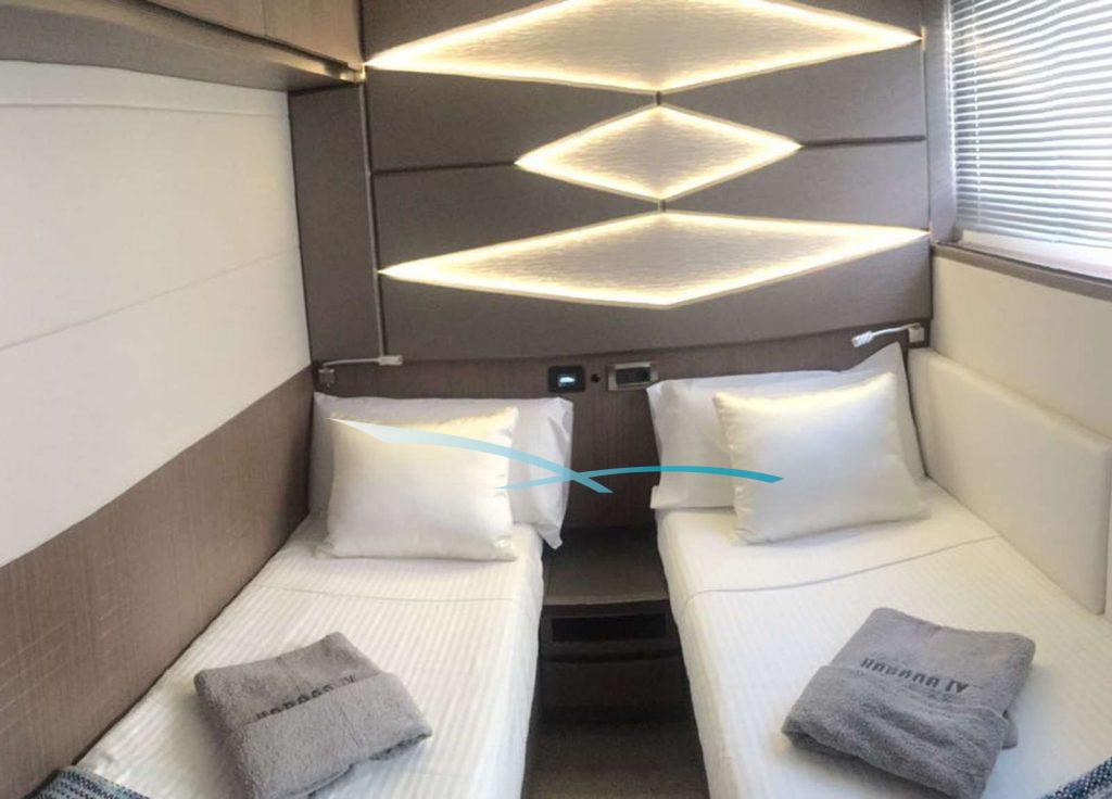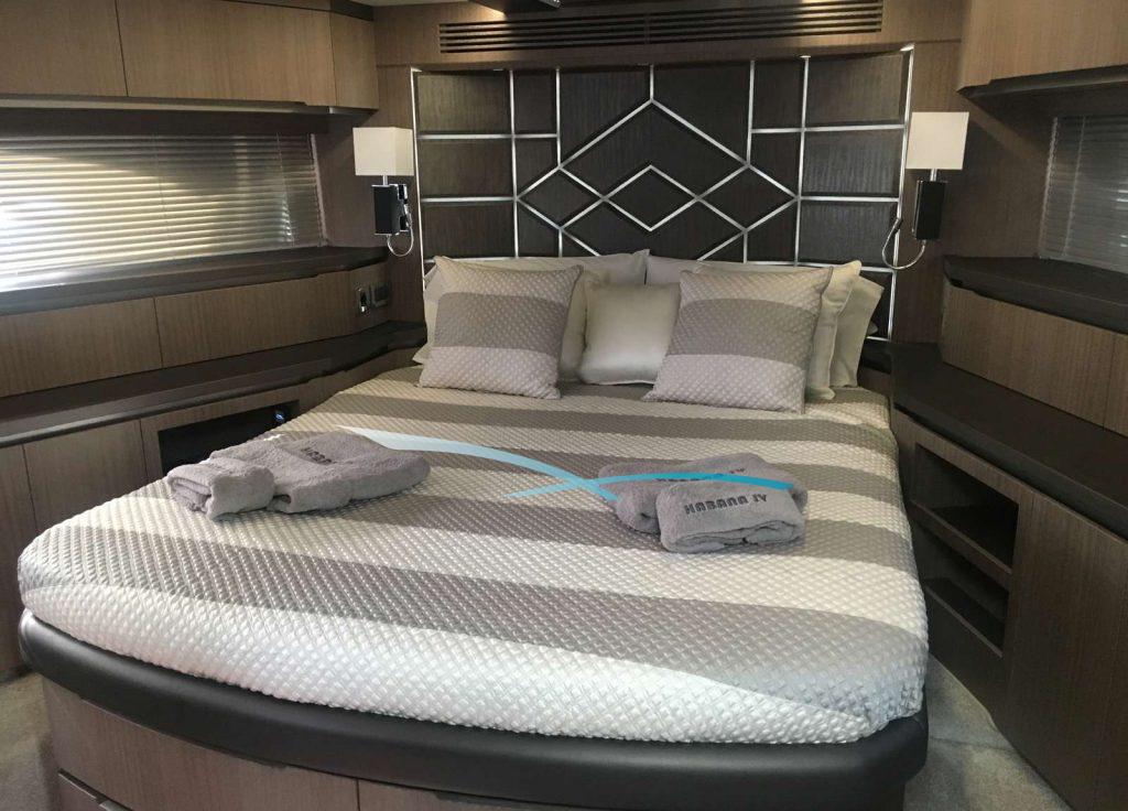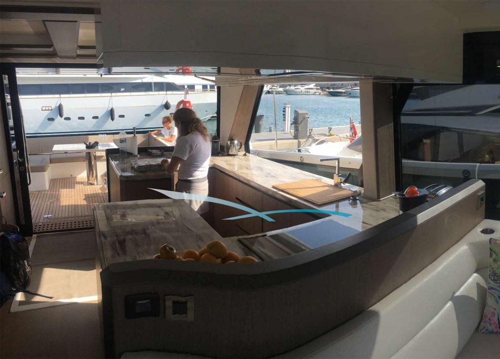 Die Galeon 640 Fly überzeugt durch ein außergewöhnlich großzügiges Raumkonzept mit vier Kabinen für bis zu acht Gäste. Große Fenster und ausklappbare Seitenbalkone schaffen eine helle, luftige Atmosphäre – fast wie ein schwimmender Beach Club.