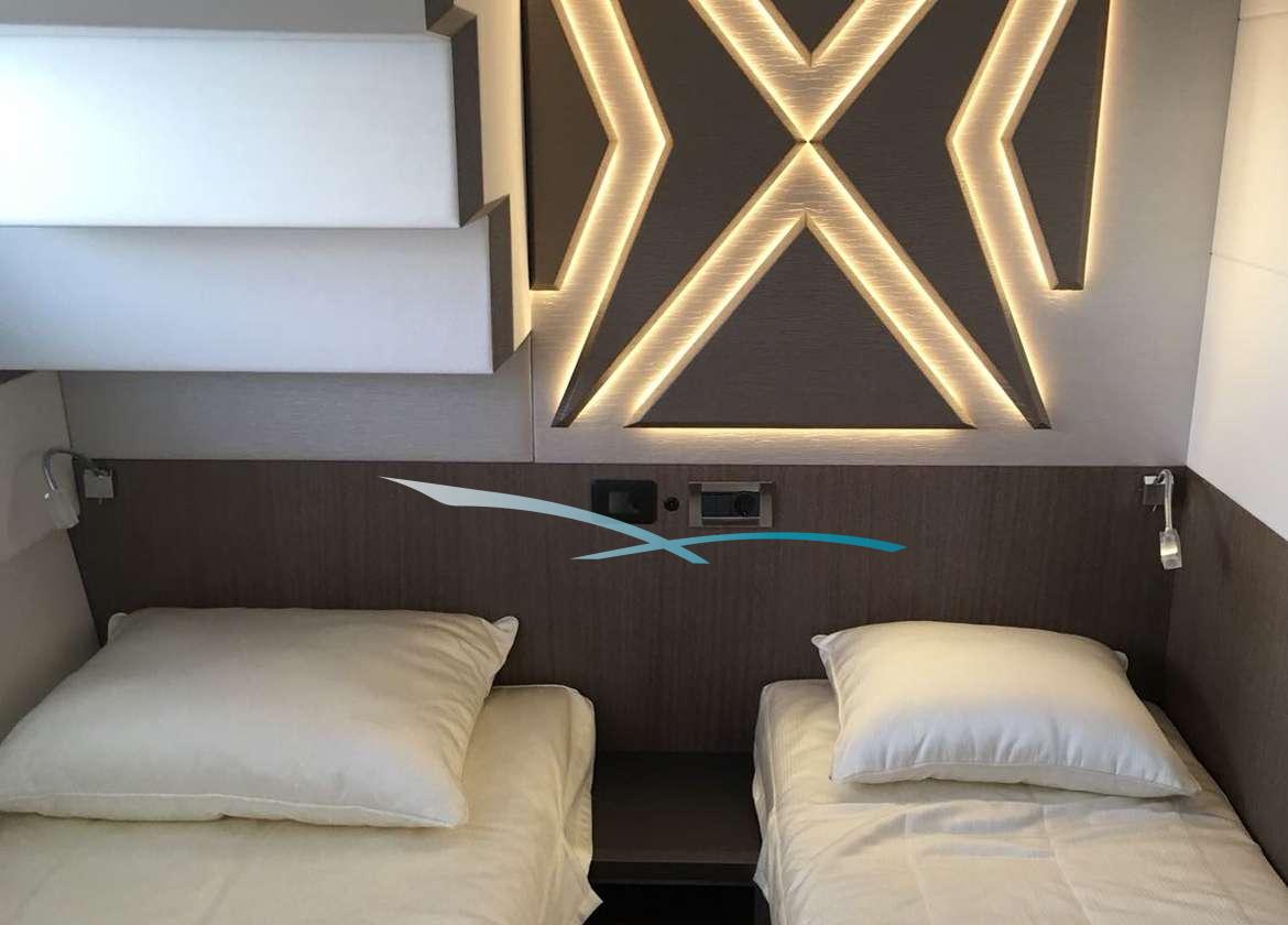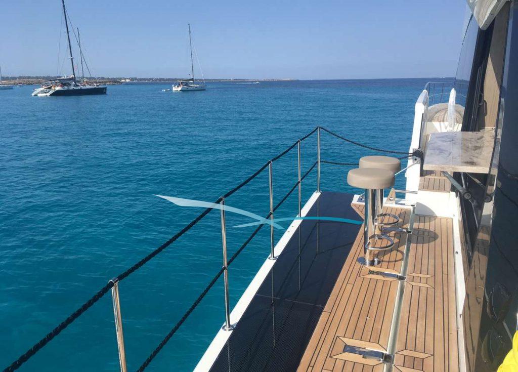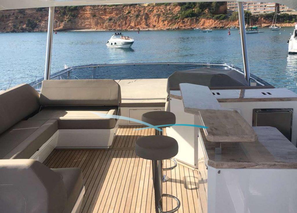 Galeon, bekannt für ihr voluminöses Äußeres setzt bei dieser Serie nun auch im Interieur aufs Ganze. Eine spannende neue Kabinenaufteilung sorgt für ein reiches Platzgefühl an Bord. Für ein luftiges Gefühl an Bord sorgen die großen Hebefenster innerhalb des Salons. Diese tragen nicht nur zu einem lichtdurchfluteten Interieur bei, sondern auch zu einem sommerlichen Fahrgefühl. Ein weiterer Wow-Effekt sind die zwei 6 m-langen, ausfahrbaren Balkone seitlich des Salons. Diese Technik ist eine echte Innovation und zaubert Beach-Club Flair an Bord. Das besondere Extra sind Stabilisatoren die sowohl vor Anker als auch währen der Fahrt für einen ruhigen Aufenthalt auf dem Wasser sorgen. Wer sich nach Action sehnt, dem steht das Williams Jet-Rib zur Verfügung. Dieses eignet sich sowohl zum Anlegen am liebsten Beach Club, als auch um beim Wassersport auf seine Kosten zu kommen. Die Galeon 640 Fly kommt in der vier-Kabinen-Version mit zwei Crew, Sie verfügt über ein elektrisches Hardtop Dach auf der Flybridge und einem Wasseraufbereiter. Die erfahrene zweiköpfige Crew bringt Sie zu den schönsten Ecken der Balearen, von Mallorca über das lebhafte Ibiza und Formentera bis hin zum idyllischen Menorca und dem Naturschutzgebiet von Cabrera.