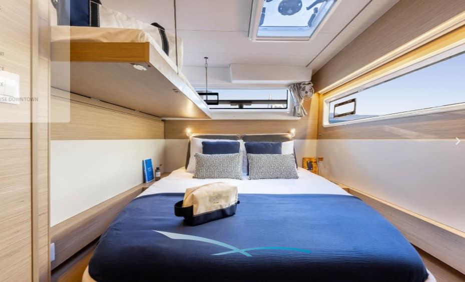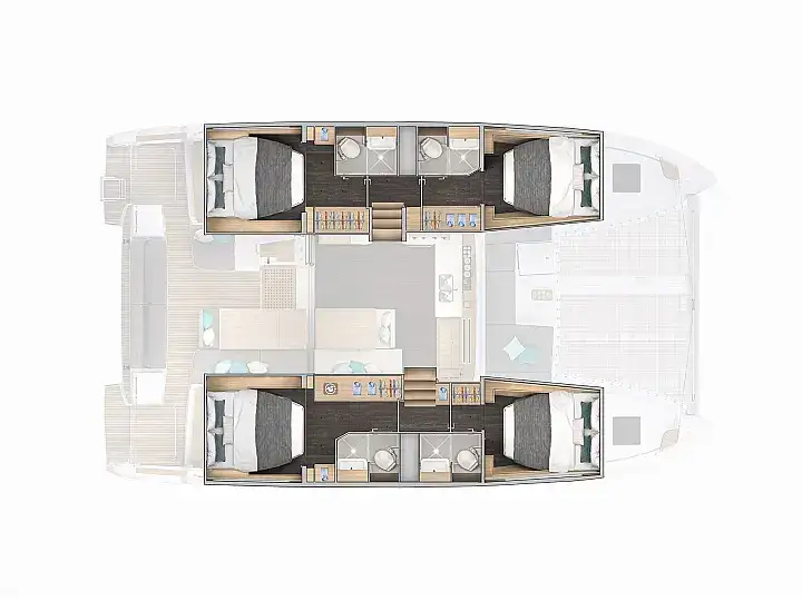 Dieser moderne Charter-Katamaran bietet vier großzügige Doppelkabinen, jede mit eigenem Bad, und ist ideal für Familien, Freunde oder Paare, die gemeinsam die Balearen erkunden möchten.