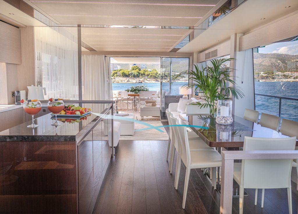 Sie bietet Platz für maximal 8 Gäste in 4 Kabinen mit jeweils eigenem Bad. Die Master-Suite, eine VIP-Kabine und 2 weitere Gäste-Kabinen. Die Master-Suite befindet sich mittschiffs auf dem unteren Deck, um die volle Breite nutzen zu können. Sie bietet ein Doppelbett, TV, ein Sofa, Schreibtisch und einen begehbaren Kleiderschrank. Hinzu kommt ein Badezimmer mit zwei Waschbecken, einer Toilette und einer Dusche. Die VIP-Kabine befindet sich im Bug und verfügt über ein Doppelbett mit TV, einem Schreibtisch und Kleiderschrank, ebenso wie ein eigenes Bad mit Waschbecken, Toilette und Dusche. Der Bereich mittschiffs bietet eine Doppelkabine an Steuerbord und eine weitere umbaubare Doppelkabine an Backbord. Beide haben TV, Kleiderschrank und ein eigenes Bad mit Waschbecken, Toilette und Dusche. Die Doppelkabine verfügt außerdem über einen Schreibtisch. Das Fin-Stabilizer-System sorgt für ruhige Tage und Nächte auf See. Auf der großzügigen Flybridge finden sich Sonnenliegen, eine großzügige Sitzgruppe – sowie eine Wetbar.