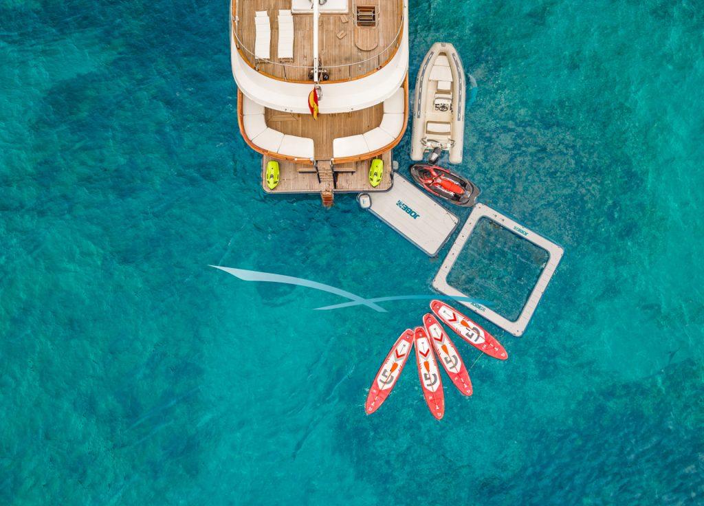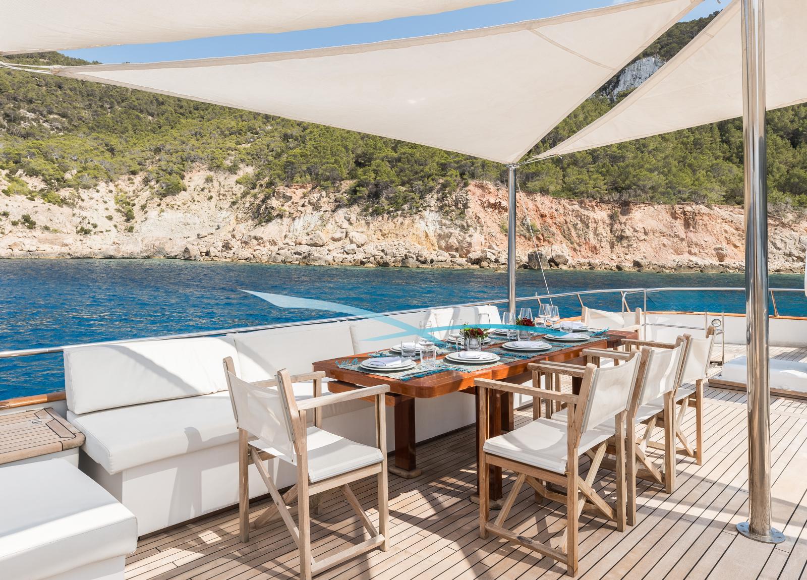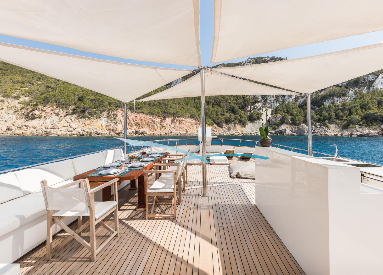 An Bord stehen verschiedene Außenbereiche zur Verfügung: für kulinarische Erlebnisse im Freien , entspanntes Sonnenbaden oder spannende Wassersportaktivitäten. Mit moderner Ausrüstung garantieren Sie den SPIRIT OF MK und ein unvergessliches Charter-Erlebnis im westlichen Mittelmeer .