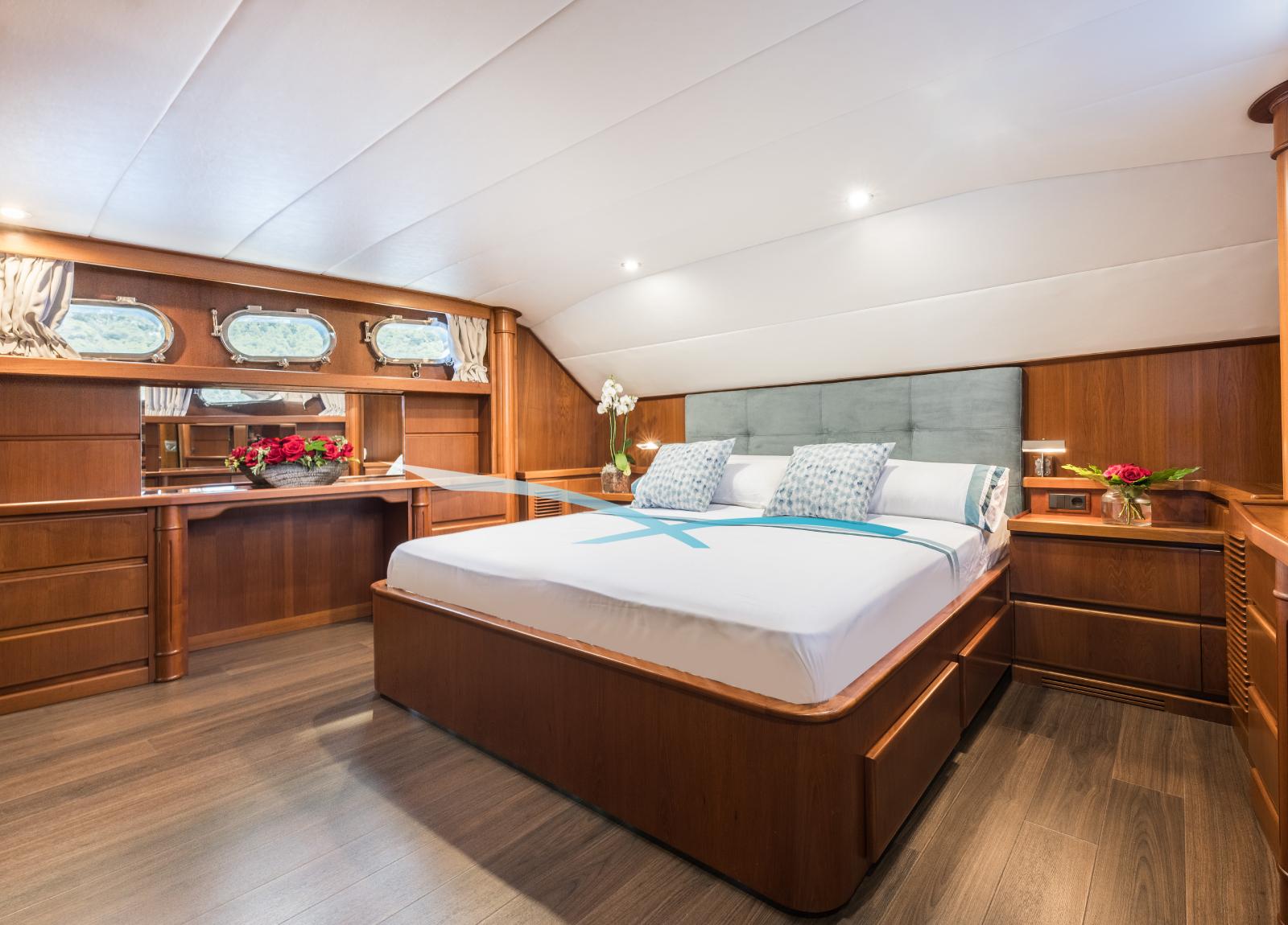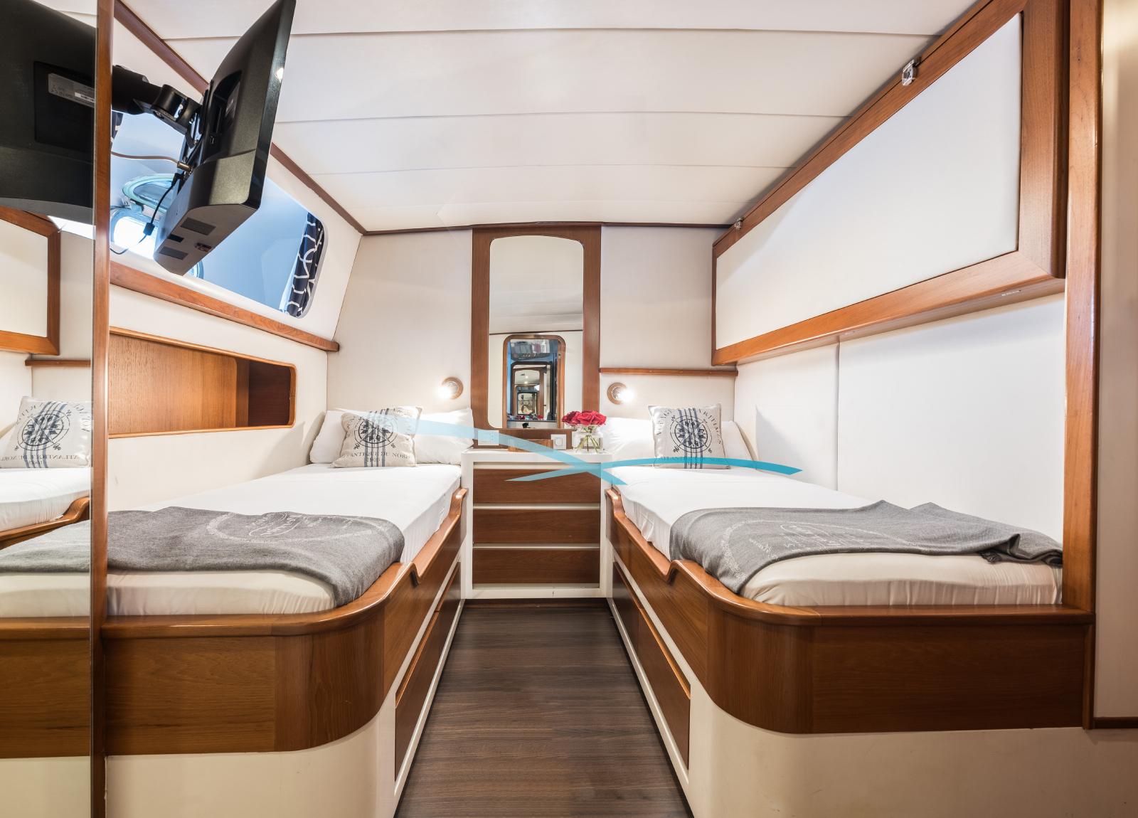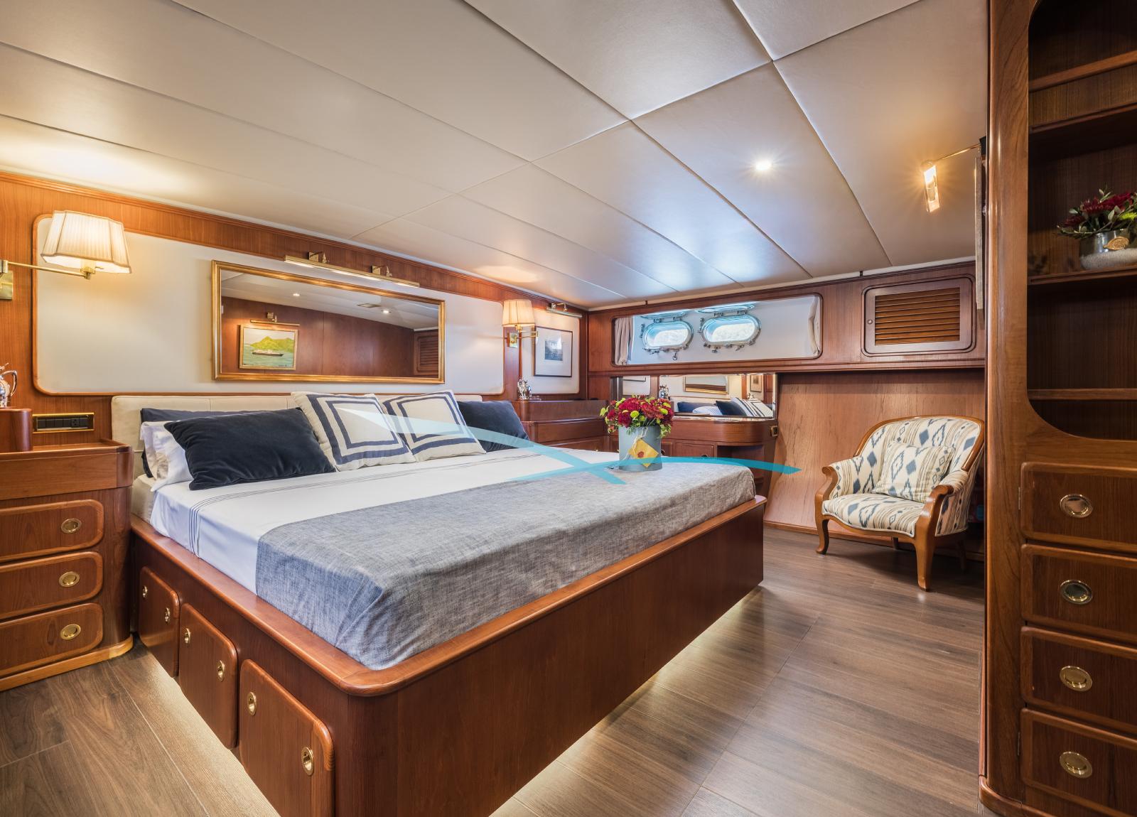 Die klassische Luxusyacht bietet Platz für bis 12 Gäste in 5 Kabinen mit eigenem Bad . Dazu zählen eine elegante Master-Suite, eine VIP-Kabine, eine Doppelkabine sowie zwei Twin-Kabinen – perfekt für Familien oder Gruppen, die Yacht auf den Balearen mieten .