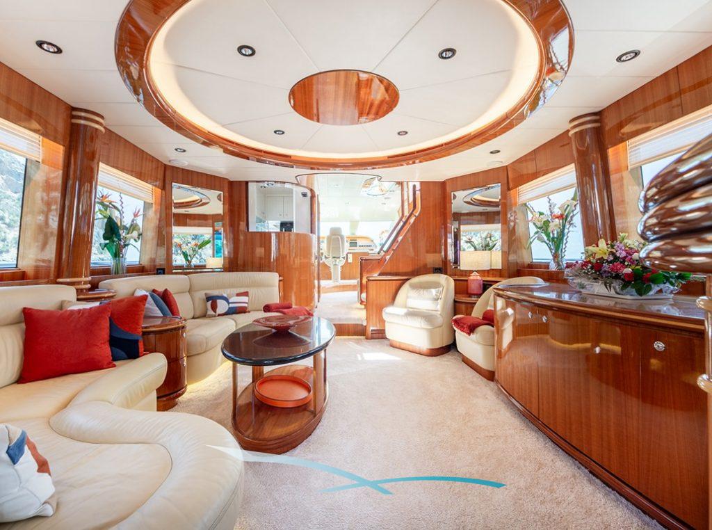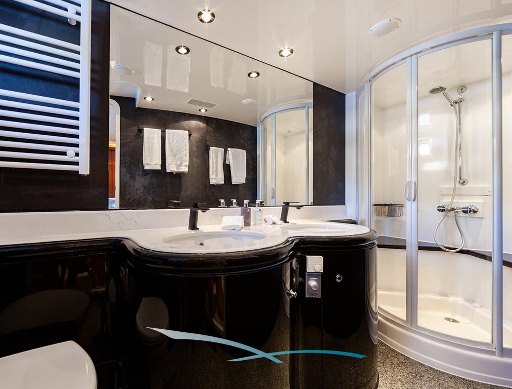 Die Yacht verfügt über drei Gästekabinen mit eigenem Bad, nämlich eine Master-Kabine, eine VIP-Kabine und eine umwandelbare Doppel-/Twin-Kabine. Eine vierte Kabine befindet sich achtern, teilt sich ein Badezimmer mit der Crew und könnte eine Option für Kinder sein.