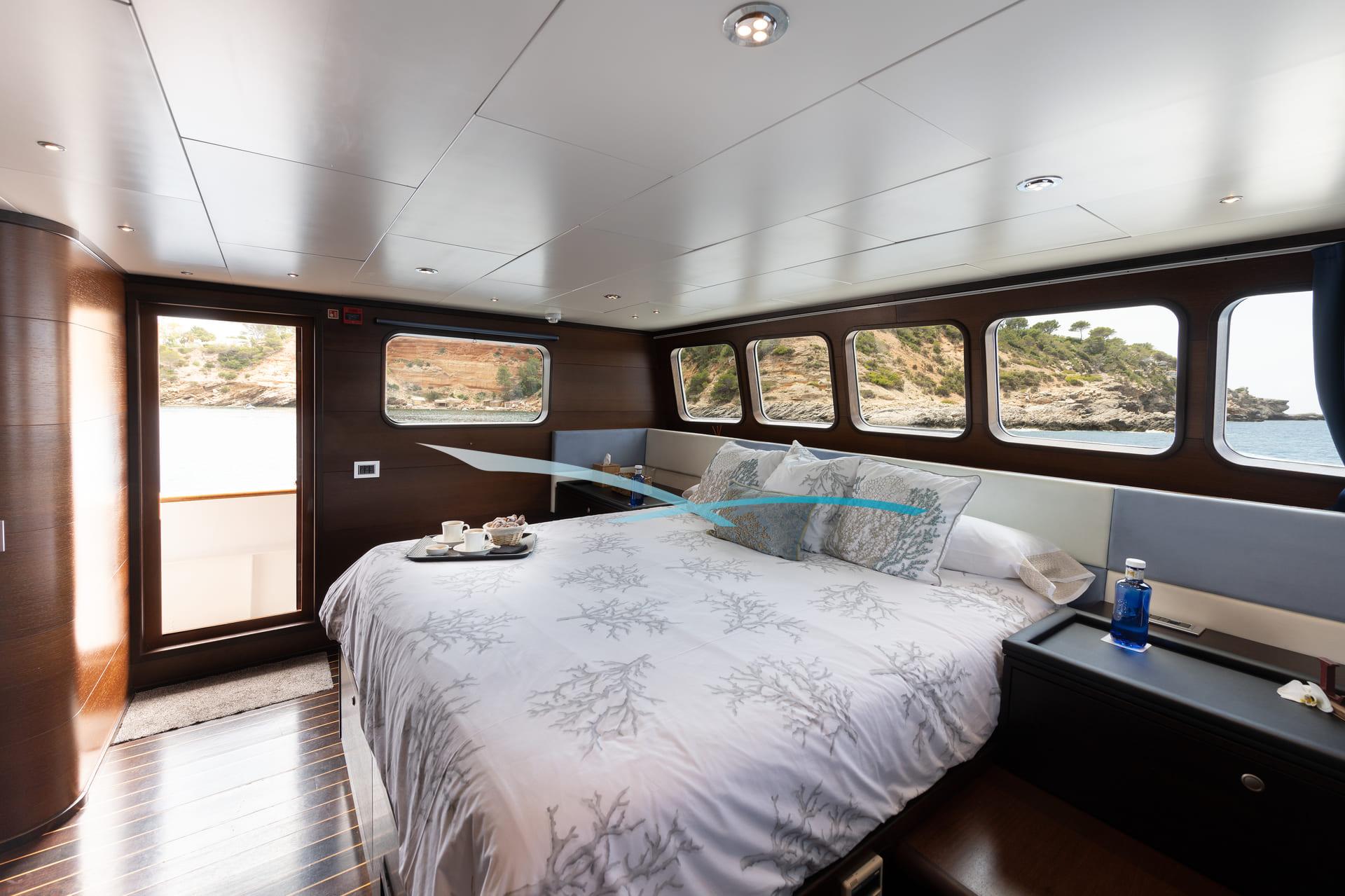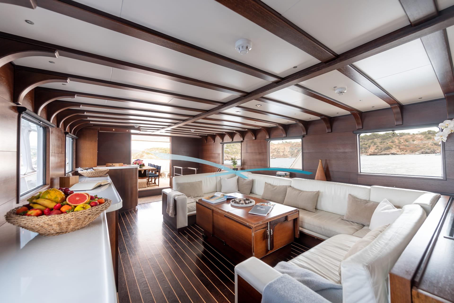An Bord befinden sich fünf luxuriöse Kabinen mit eigenem Bad, die Platz für bis zu 12 Gäste bieten. Die klassische Inneneinrichtung kombiniert warmes Holz mit maritimen Akzenten und sorgt für eine einladende Atmosphäre.