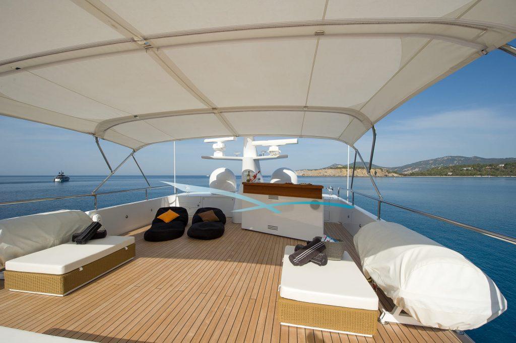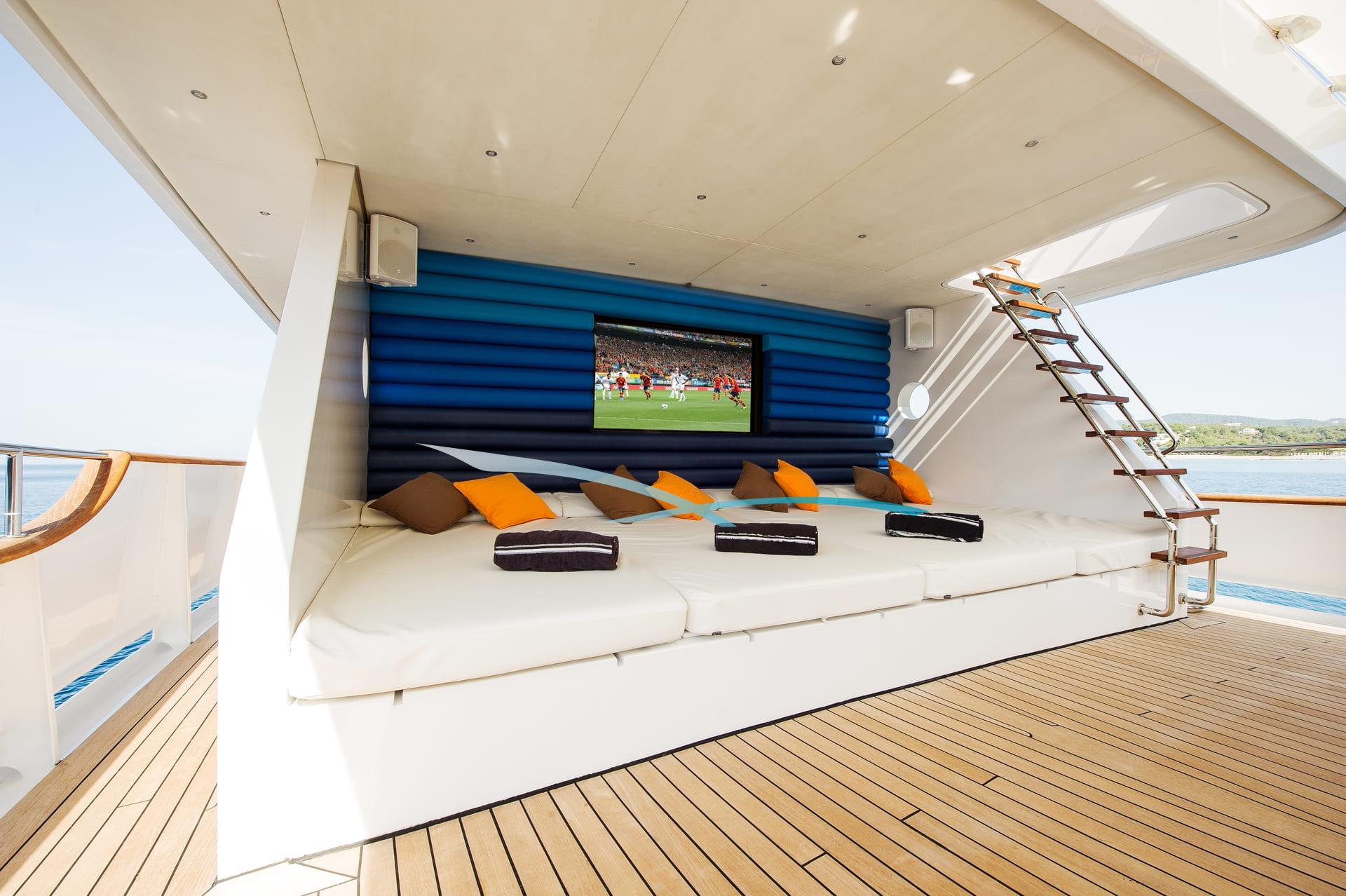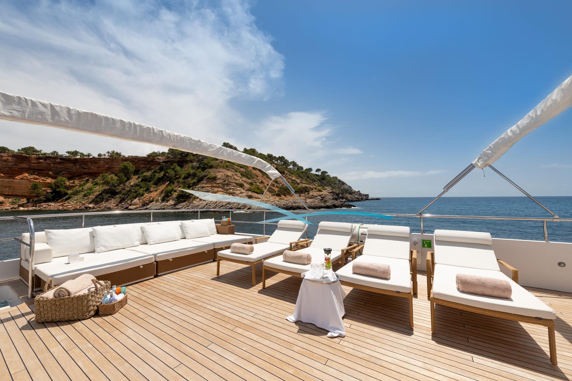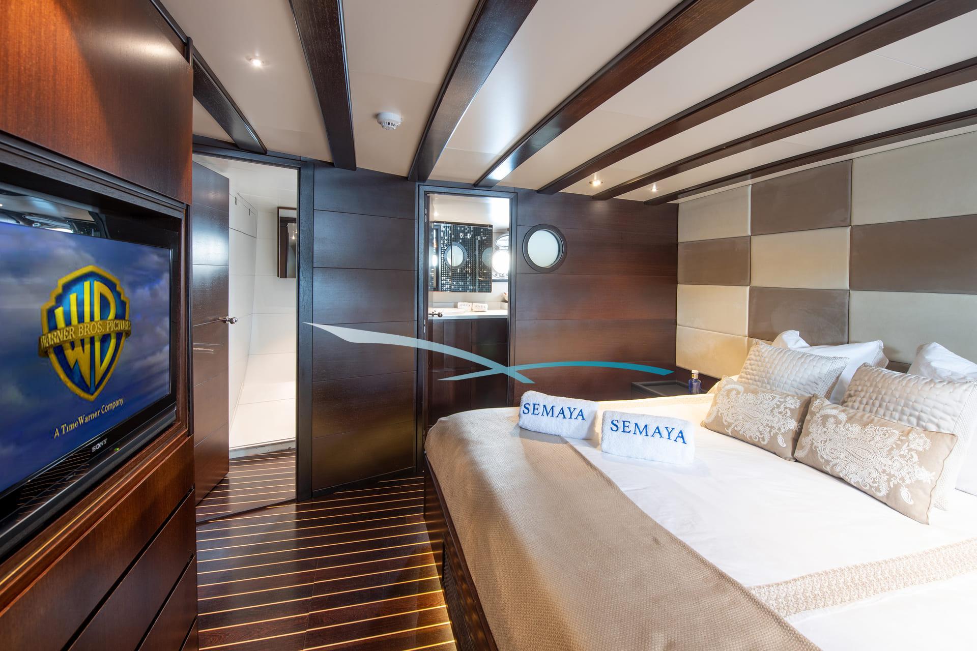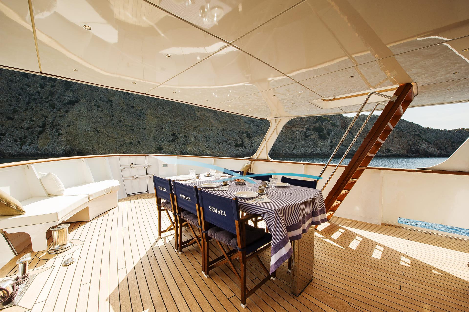 Mit vier großzügigen Decks bietet die Semaya reichlich Platz für Privatsphäre und Gemeinschaft – sowohl im Innen- als auch im Außenbereich. Das Hauptdeck punktet mit einem stilvollen Salon und einer neu ausgestatteten Küche, während das dritte Deck mit Lounge-Bereich, Esstisch und Solarium perfekte Rückzugsorte für gesellige Stunden in der Sonne bereithält. Die Flybridge ist mit Sonnenliegen, Wet Bar, Sofaecke und einem modernen Soundsystem ausgestattet – ideal für Sundowner mit Meerblick.