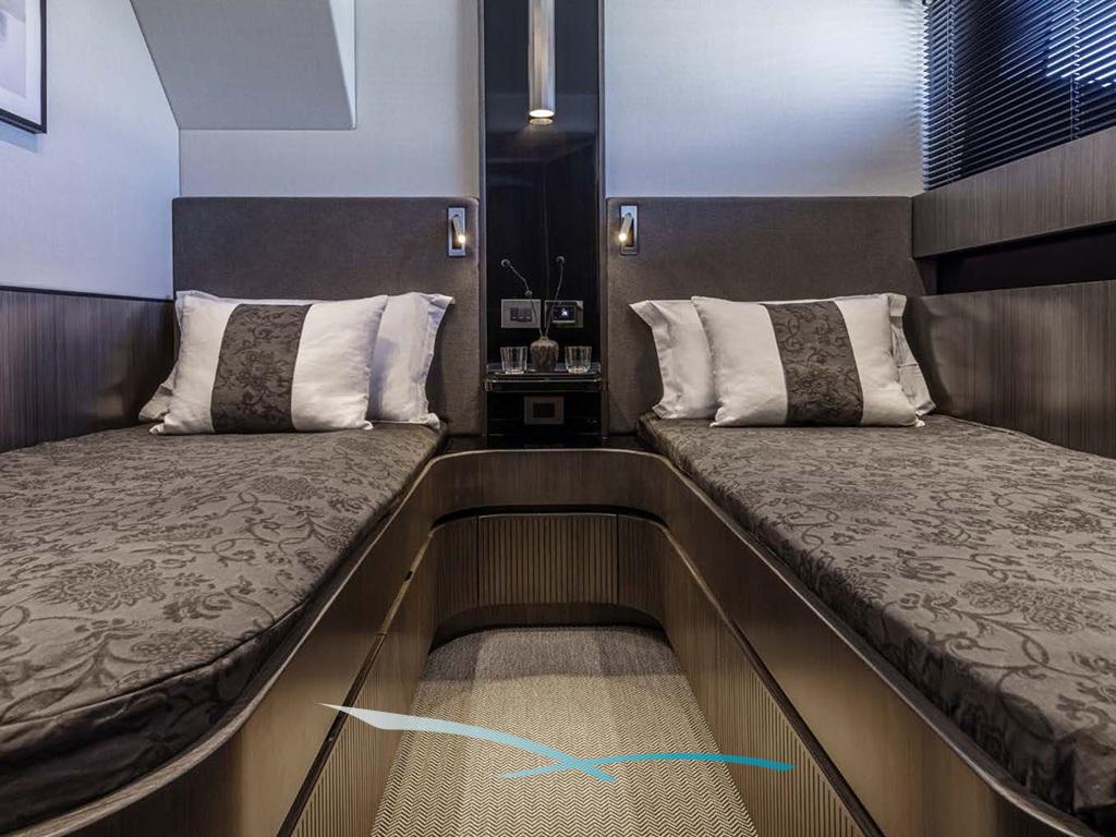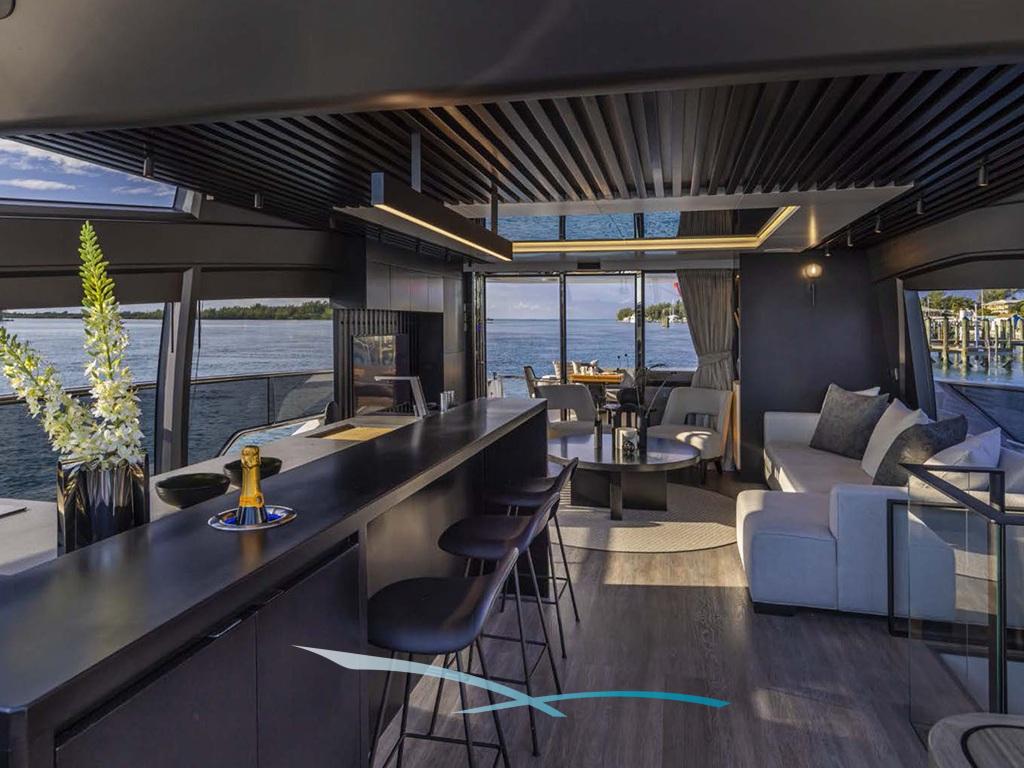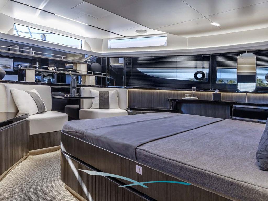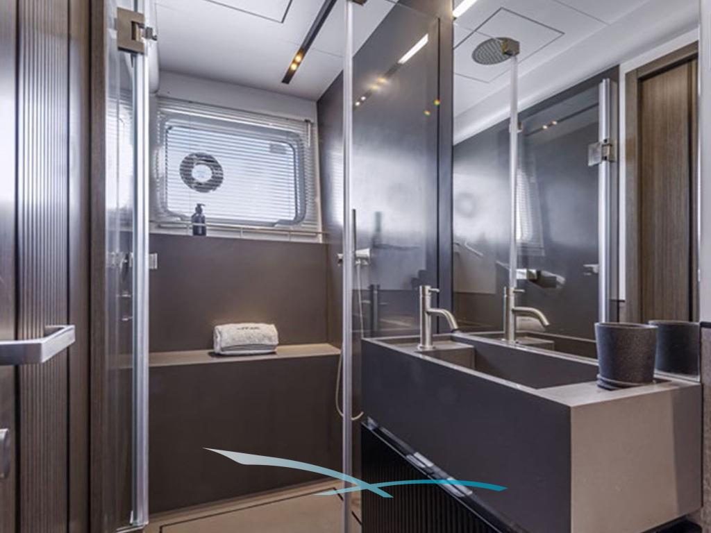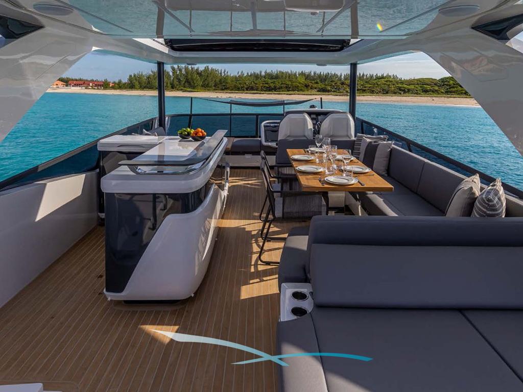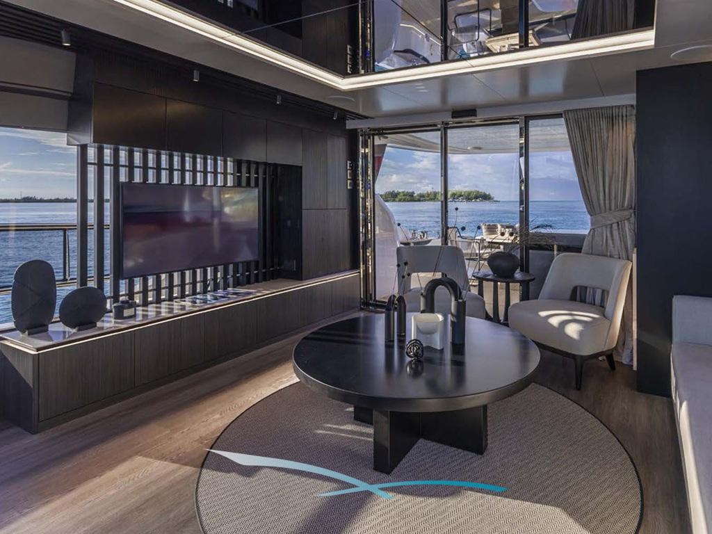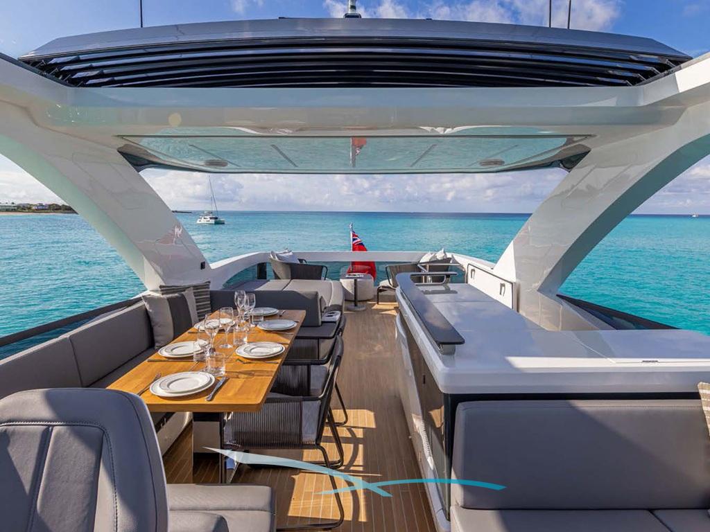 Sie verfügt über vier großzügige en-suite Kabinen, weitläufige Innen- und Außenbereiche sowie einen stilvollen, offenen Grundriss mit warmer, moderner Atmosphäre. Auf dem Deck lädt der Bugbereich mit verstellbaren Sonnenliegen, Sitzgelegenheiten und Essbereich zum entspannten Verweilen unter der mediterranen Sonne ein.