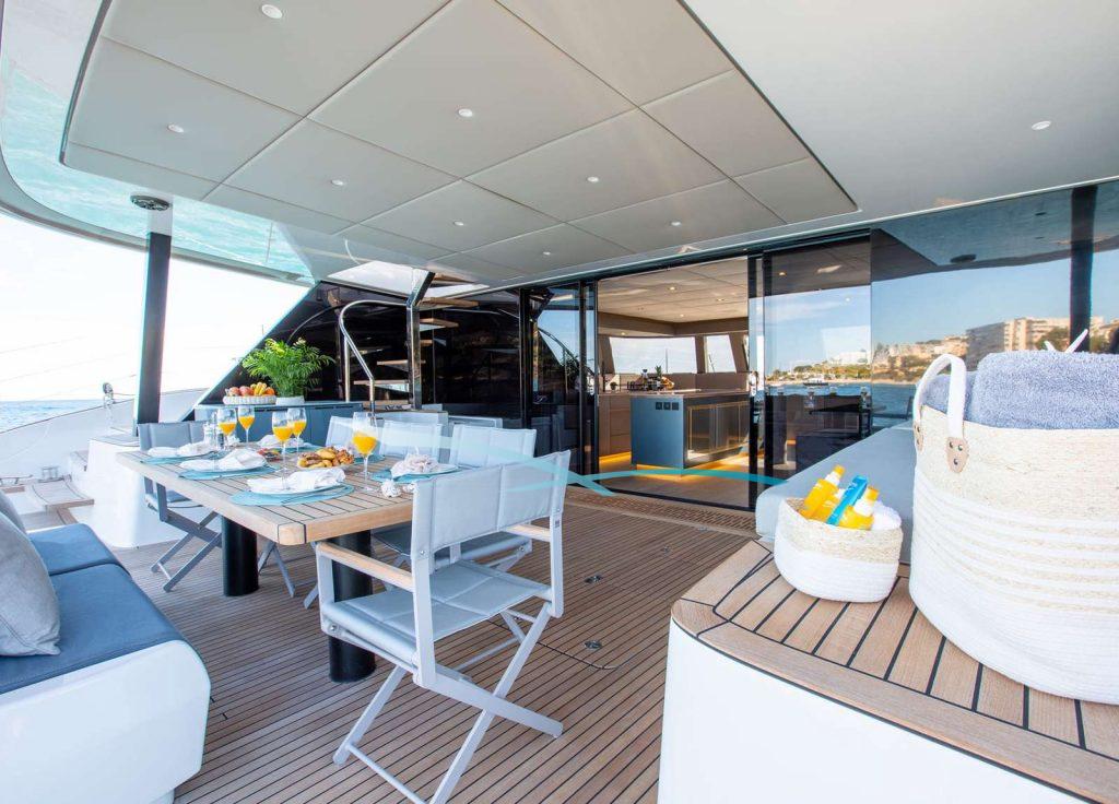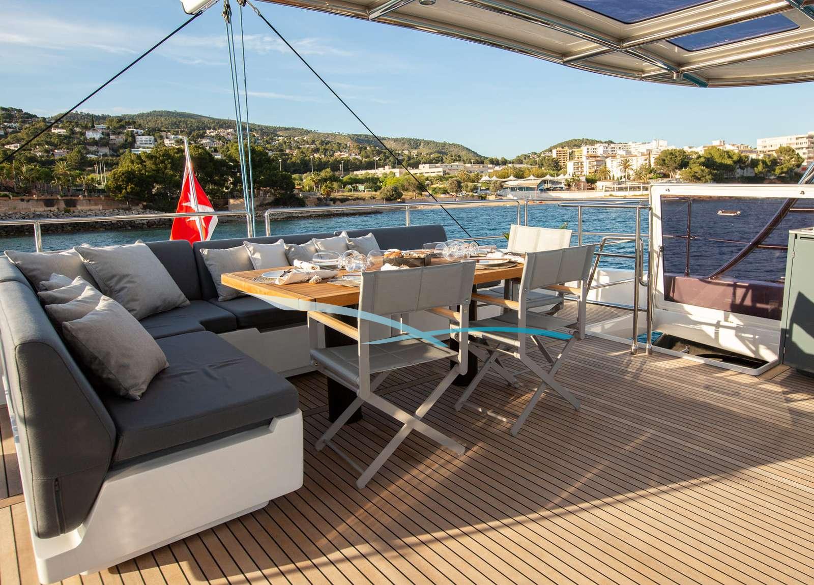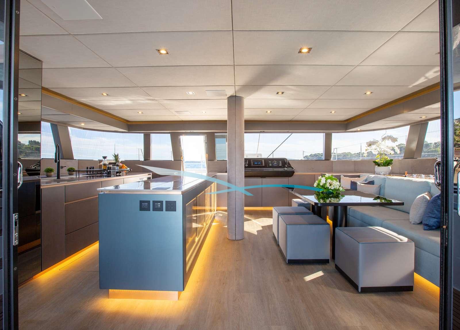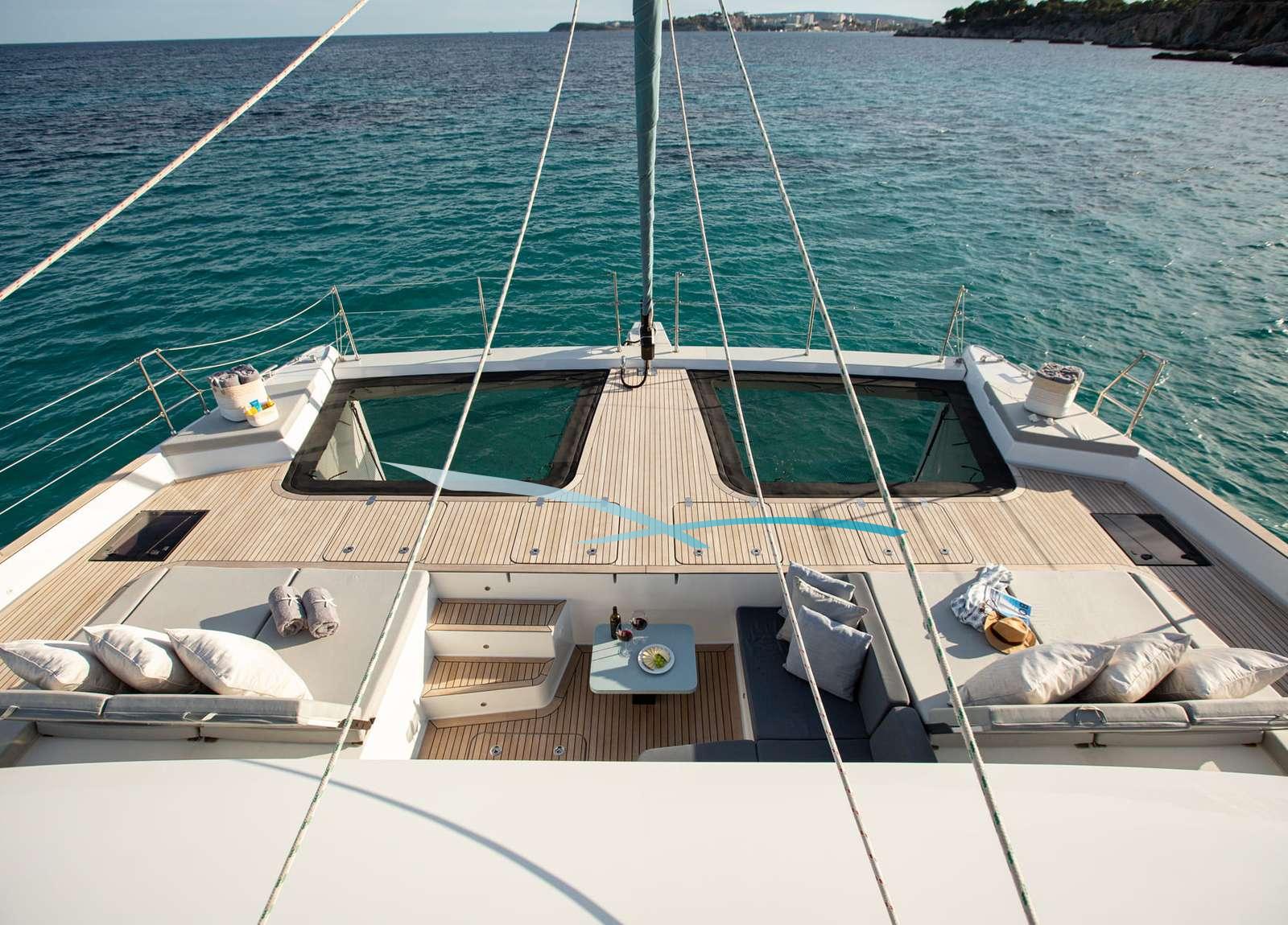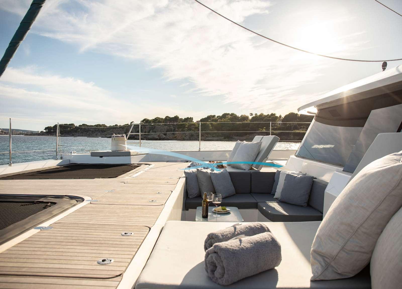 Dieser moderne Katamaran vereint durchdachtes Design mit maximalem Komfort und bietet dank großzügiger Fensterflächen einen fantastischen Panoramablick über das Mittelmeer.