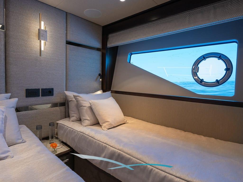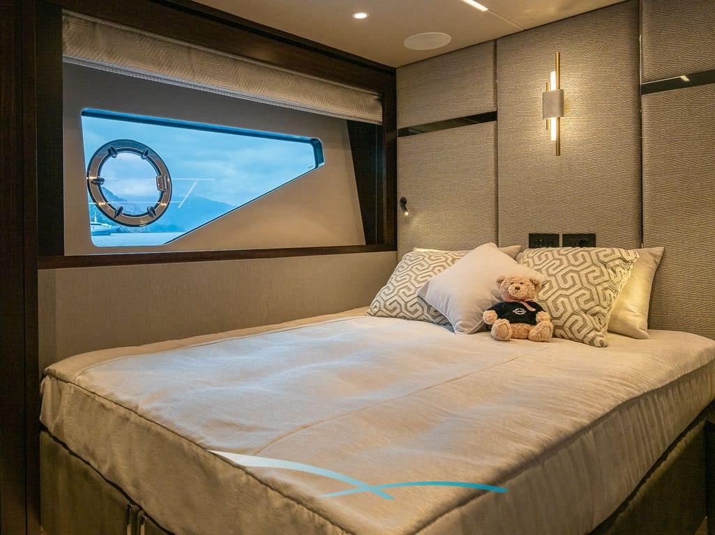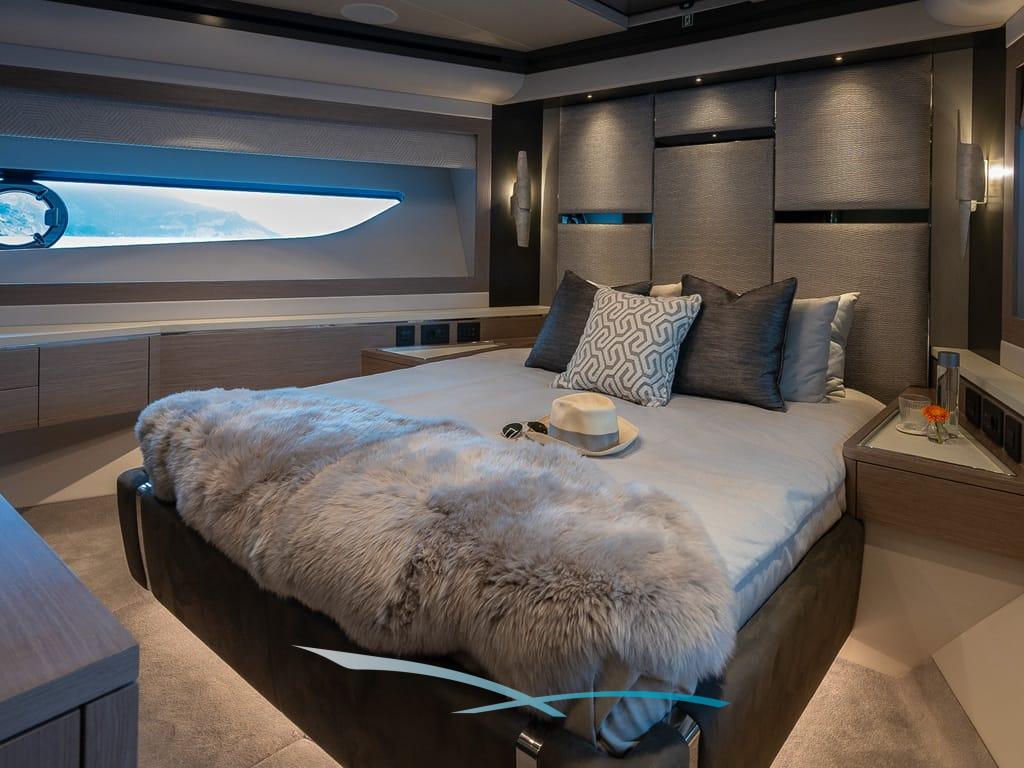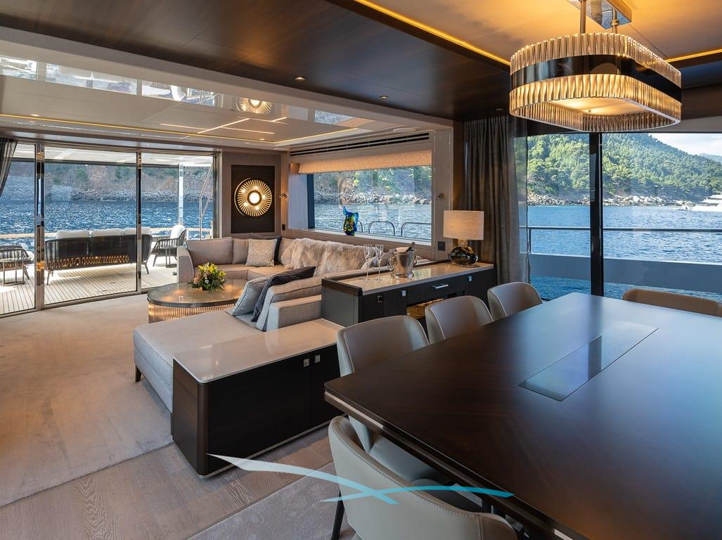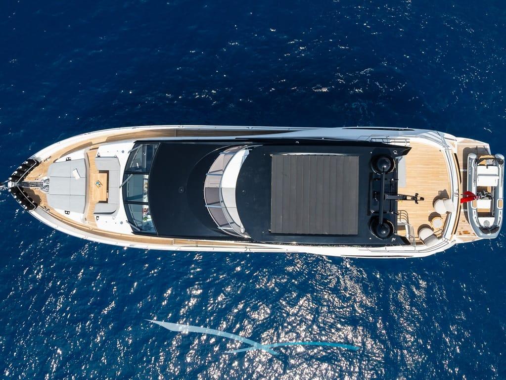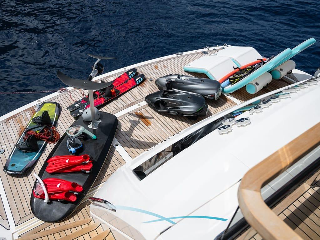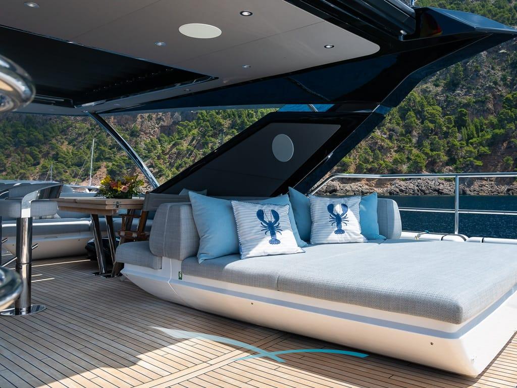 Großzügige Außenbereiche, eine weitläufige Flybridge mit Wet Bar, Sonnenpolstern und verstellbarem Sonnendach sowie eine hydraulische Badeplattform mit Beach-Club-Setup laden zum Entspannen ein. Moderne Zero-Speed-Stabilisatoren und eine Auswahl an Wasserspielzeug – darunter Seabobs, Paddleboards, ein Fliteboard und ein Williams Jet Tender – runden das luxuriöse Chartererlebnis perfekt ab.