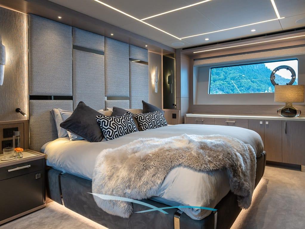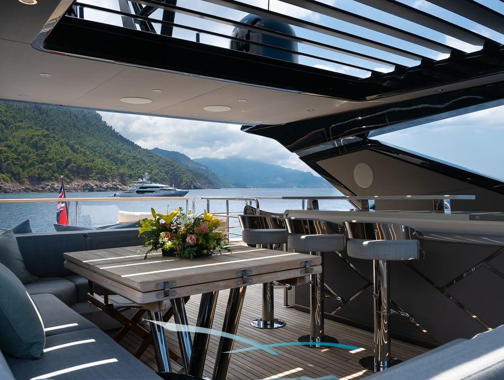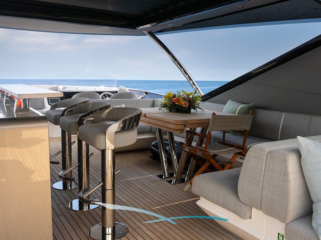 Großzügige Außenbereiche, eine weitläufige Flybridge mit Wet Bar, Sonnenpolstern und verstellbarem Sonnendach sowie eine hydraulische Badeplattform mit Beach-Club-Setup laden zum Entspannen ein. Moderne Zero-Speed-Stabilisatoren und eine Auswahl an Wasserspielzeug – darunter Seabobs, Paddleboards, ein Fliteboard und ein Williams Jet Tender – runden das luxuriöse Chartererlebnis perfekt ab.