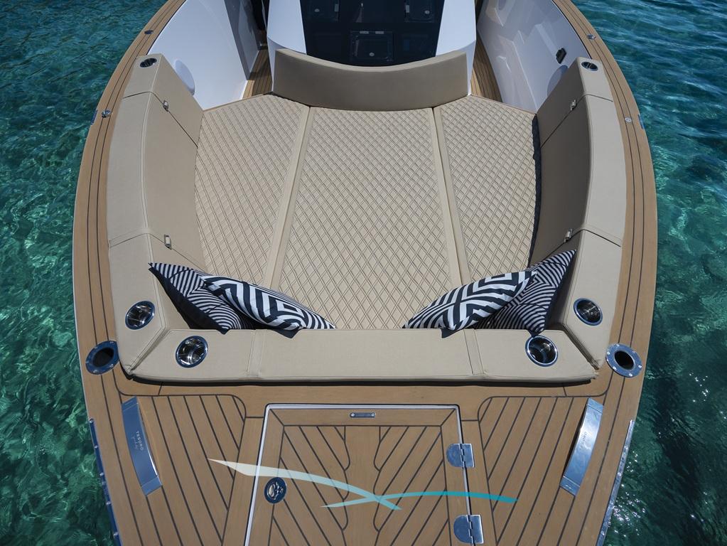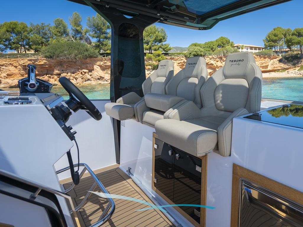 Die TESORO T40 Outboard ist die perfekte Wahl für einen exklusiven Tagescharter ab Puerto Portals. Mit ihrem eleganten Design, kraftvollen Außenbordmotoren und luxuriöser Ausstattung bietet sie höchsten Komfort auf dem Wasser. Das geräumige Sonnendeck, gemütliche Sitzbereiche und eine Badeplattform laden zum Entspannen ein, während modernste Technik und erstklassige Performance für ein einzigartiges Fahrerlebnis sorgen. Eine zusätzliche Beschattung ist im Heckbereich der T40 gegeben.