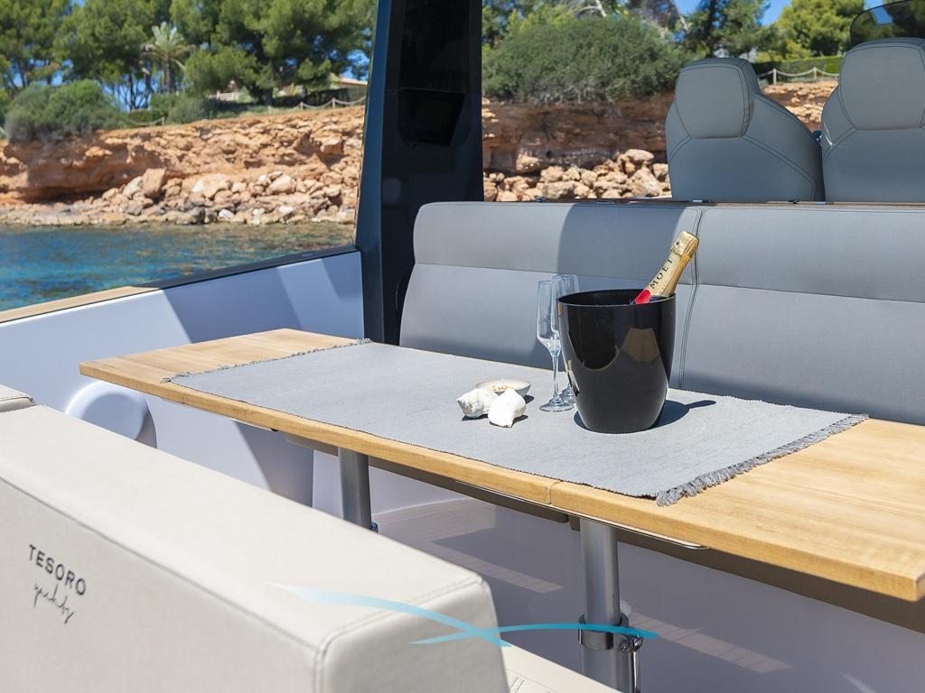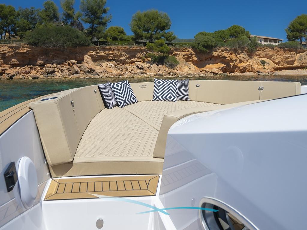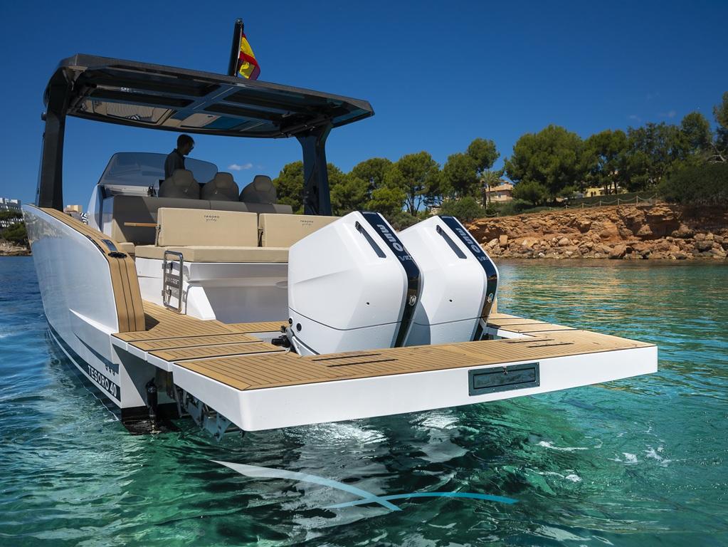 Die TESORO T40 Outboard ist die perfekte Wahl für einen exklusiven Tagescharter ab Puerto Portals. Mit ihrem eleganten Design, kraftvollen Außenbordmotoren und luxuriöser Ausstattung bietet sie höchsten Komfort auf dem Wasser. Das geräumige Sonnendeck, gemütliche Sitzbereiche und eine Badeplattform laden zum Entspannen ein, während modernste Technik und erstklassige Performance für ein einzigartiges Fahrerlebnis sorgen. Eine zusätzliche Beschattung ist im Heckbereich der T40 gegeben.