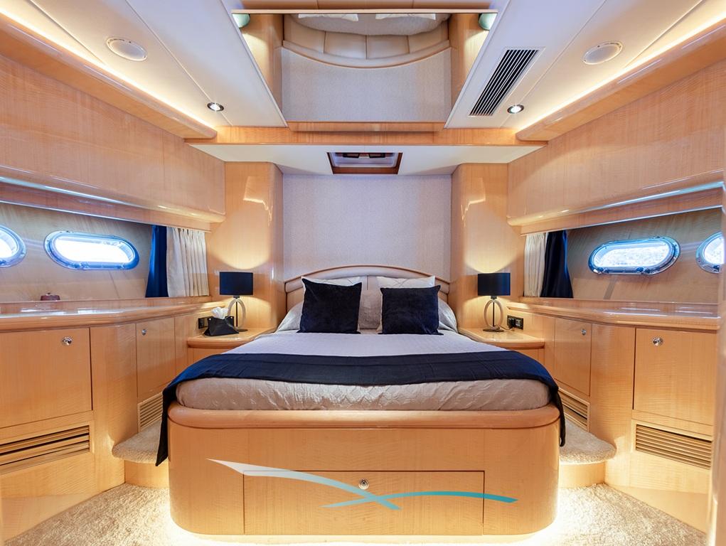 Die Yacht verfügt über drei Gästekabinen mit eigenem Bad, nämlich eine Master-Kabine, eine VIP-Kabine und eine umwandelbare Doppel-/Twin-Kabine. Eine vierte Kabine befindet sich achtern, teilt sich ein Badezimmer mit der Crew und könnte eine Option für Kinder sein.